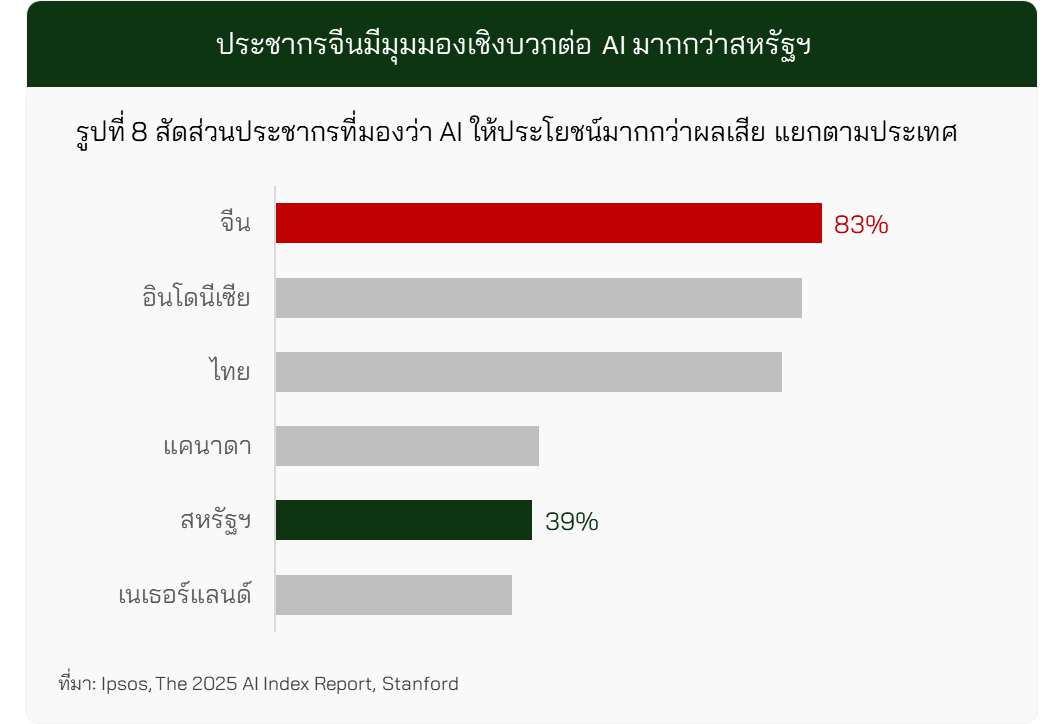 มากไปกว่านั้น มุมมองของประชากรจีนกลับมีความเปิดรับต่อเทคโนโลยีมากกว่า โดยผลสำรวจจากมหาวิทยาลัย Stanford ชี้ว่า 83% ของชาวจีนมองว่า AI มีประโยชน์ ขณะที่ในสหรัฐฯ มีเพียง 39% เท่านั้น ทำให้ฐานผู้ใช้และการทดลองใช้งาน AI ในจีนเติบโตได้รวดเร็วอย่างมีนัยสำคัญ (รูปที่ 8)