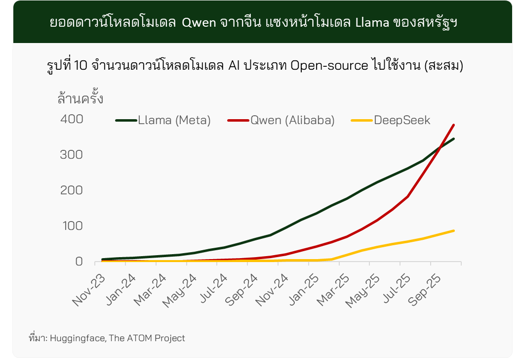 โมเดล AI แบบเปิดจากสหรัฐฯ ที่เคยได้รับความนิยมสูง เช่น Llama ของบริษัท Meta ก็กำลังเผชิญการแข่งขันที่เข้มข้นขึ้นจากโมเดลจีนอย่าง Qwen (Alibaba) และ DeepSeek โดยข้อมูลล่าสุดจากแพลตฟอร์ม Hugging Face ระบุว่า โมเดล Qwen มียอดดาวน์โหลดสูงกว่า Llama แล้ว สะท้อนให้เห็นว่าโมเดล AI แบบเปิดจากจีนได้รับความนิยมในการนำไปใช้งานมากขึ้นอย่างชัดเจน