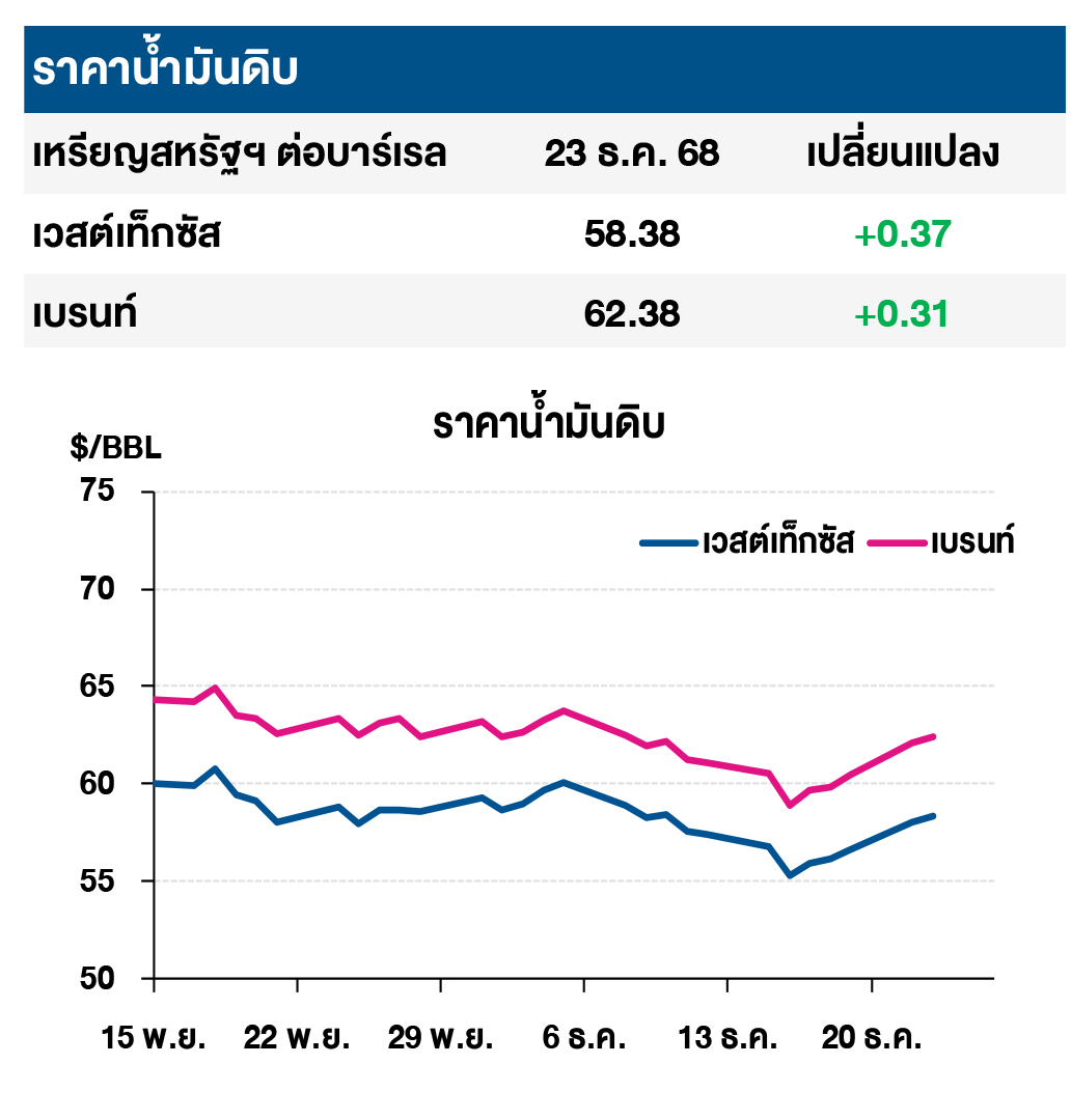 (+) ราคาน้ำมันดิบปรับเพิ่มขึ้น หลังสำนักงานวิเคราะห์เศรษฐกิจของกระทรวงพาณิชย์สหรัฐฯ รายงานประมาณการเบื้องต้นของ GDP สหรัฐฯ ไตรมาสที่ 3 เมื่อวันที่ 23 ธ.ค. 68 ที่ผ่านมา ว่าอยู่ที่ระดับร้อยละ 4.3 ต่อปี เติบโตเร็วกว่าที่คาดการณ์ไว้ โดยได้รับแรงหนุนจากการใช้จ่ายของผู้บริโภคที่แข็งแกร่ง การส่งออกที่ฟื้นตัวอย่างรวดเร็ว และการลงทุนอย่างต่อเนื่องของภาคธุรกิจด้านอุปกรณ์และปัญญาประดิษฐ์ (AI) แม้ว่านักวิเคราะห์ยังคงกังวลต่อมาตรการภาษีตอบโต้ของสหรัฐฯ ที่ส่งผลต่ออัตราเงินเฟ้อของสหรัฐฯ ที่ปรับสูงขึ้น และภาคครัวเรือนที่จะต้องแบกรับค่าใช้จ่ายสินค้าและสาธารณูปโภคที่สูงขึ้น