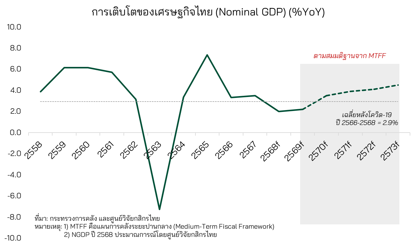 แผนการคลังระยะปานกลางปี 2570-2573 ที่คณะรัฐมนตรีมีมติเห็นชอบเมื่อวันที่ 18 พ.ย. 2568 แสดงให้เห็นถึงความตั้งใจของรัฐบาลที่จะลดการขาดดุลงบประมาณให้ต่ำกว่า 3.0% ต่อ GDP ในปี 2572 แต่ความเสี่ยงที่ไทยจะถูกปรับลดอันดับความน่าเชื่อถือในระยะข้างหน้ายังคงมีอยู่ ด้วยเหตุผลดังนี้