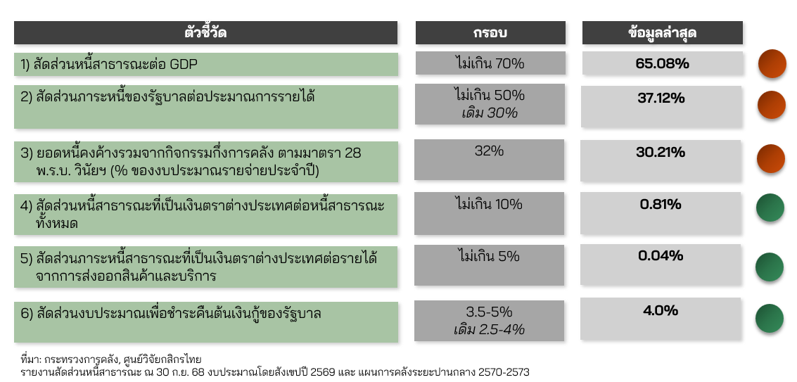 ในปี 2564 รัฐบาลจึงต้องขยายเพดานเป็น 70% ของ GDP อย่างไรก็ดี ระดับหนี้สาธารณะไทยปัจจุบัน ณ เดือนต.ค. 2568 อยู่ที่ 65.2% ของ GDP ซึ่งยังต่ำกว่าค่าเฉลี่ยของประเทศตลาดเกิดใหม่ (Emerging Market) ที่ 69.0% ของ GDP แต่แนวโน้มหนี้สาธารณะของไทยอยู่ในจุดที่น่ากังวลมากกว่า เนื่องจากแนวโน้มเศรษฐกิจไทยที่เติบโตต่ำ