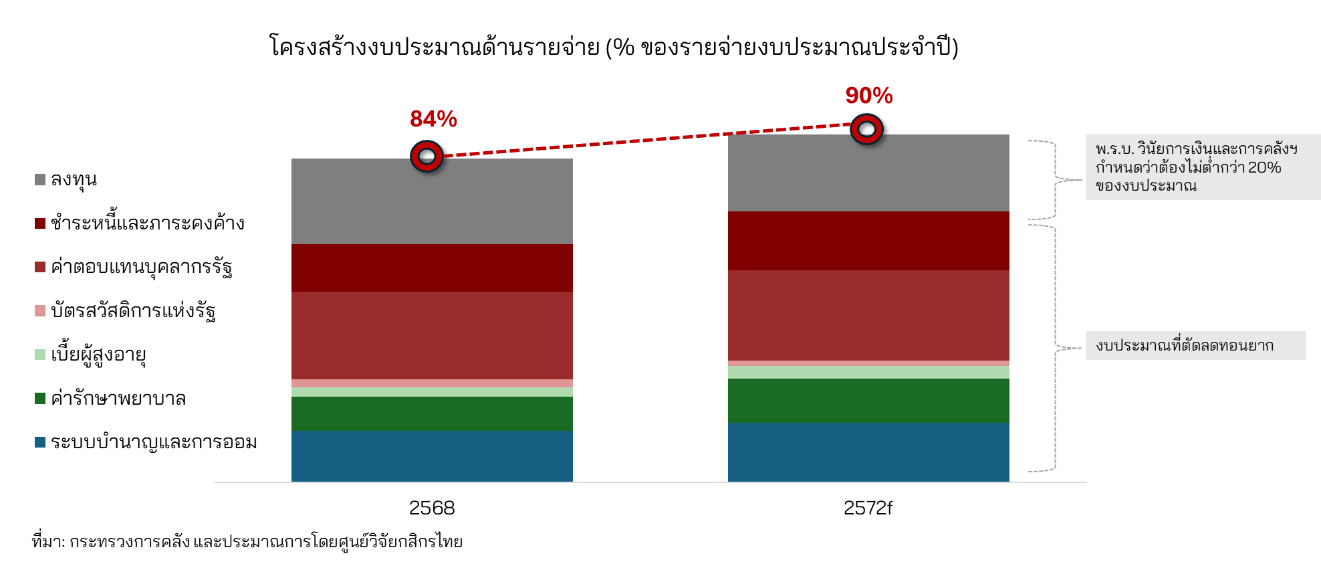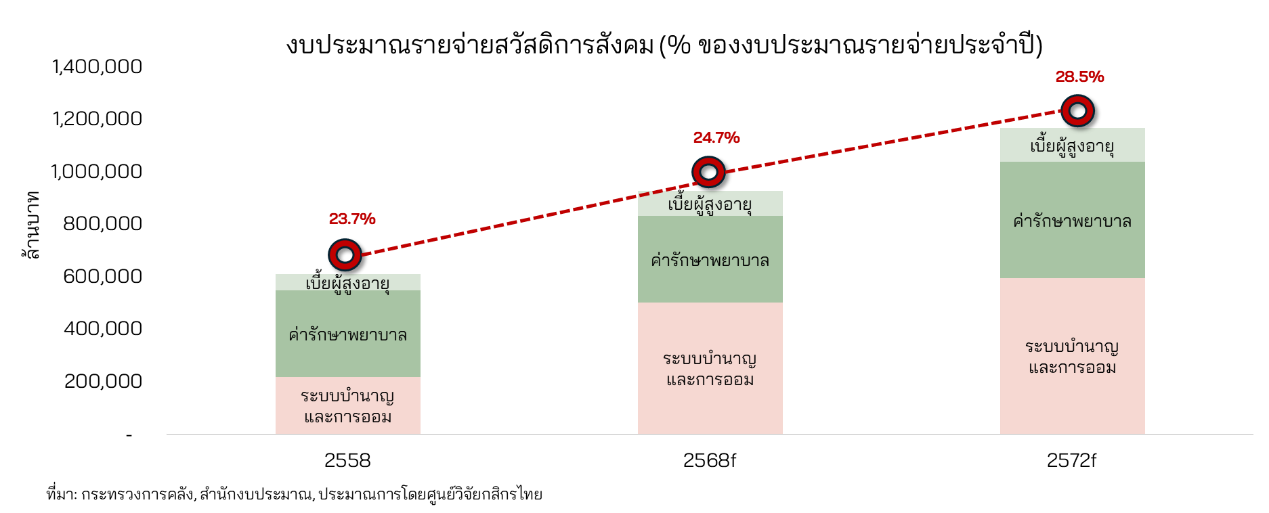 3. ภาระงบประมาณจากสังคมสูงวัยเร่งตัว โดยในปี 2572 ไทยจะเข้าสู่สังคมสูงวัยแบบสมบูรณ์ (Super-aged society) หรือ 20% ของประชากรไทยมีอายุมากกว่า 65 ปี ซึ่งหมายถึงภาระทางการคลังที่จะเพิ่มขึ้นจากทั้งรายจ่ายงบประมาณด้านบำนาญ การออม งบประมาณรายจ่ายด้านสาธารณะสุข เช่น บัตรทอง สวัสดิการข้าราชการ รวมถึงสวัสดิการผู้สูงอายุ โดยศูนย์วิจัยกสิกรไทยประเมินงบประมาณรายจ่ายของรัฐที่เกี่ยวเนื่องกับสังคมสูงวัยจะเพิ่มจาก 24.7% ของงบประมาณรายจ่ายประจำปี ในปี 2568 ไปเป็น 28.5% ของงบประมาณรายจ่ายประจำปี ในปี 2572 (รูปที่ 5)