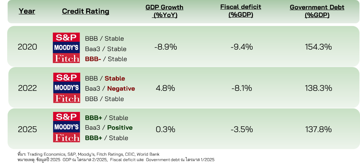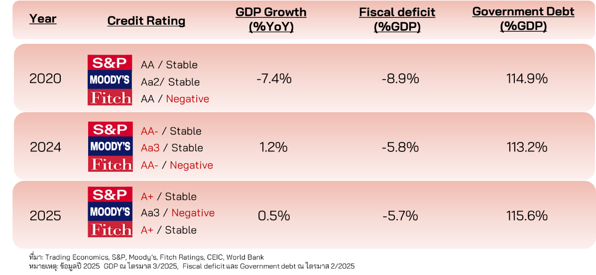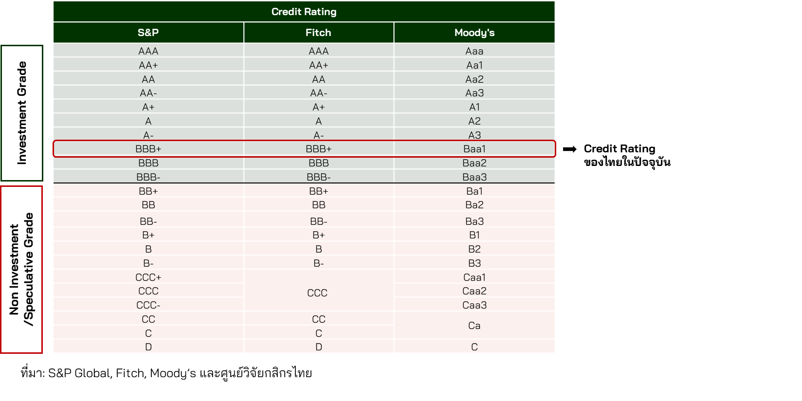 ฐานะการคลังของไทยอ่อนแอกว่าประเทศที่มีอันดับความน่าเชื่อถือระดับเดียวกัน (BBB+ หรือ Baa1) โดยเฉพาะหนี้สาธารณะที่เพิ่มเร็วและการขาดดุลที่สูงต่อเนื่อง หากเศรษฐกิจไทย (Nominal GDP) เติบโตเพียง 3% ต่อปี การขาดดุลอาจยังเกิน -4% ของ GDP และหนี้สาธารณะอาจแตะเพดาน 70% ภายในปี 2570 สถานการณ์ดังกล่าวเพิ่มความเสี่ยงที่ไทยจะถูกปรับลดอันดับความน่าเชื่อถือในระยะข้างหน้า
