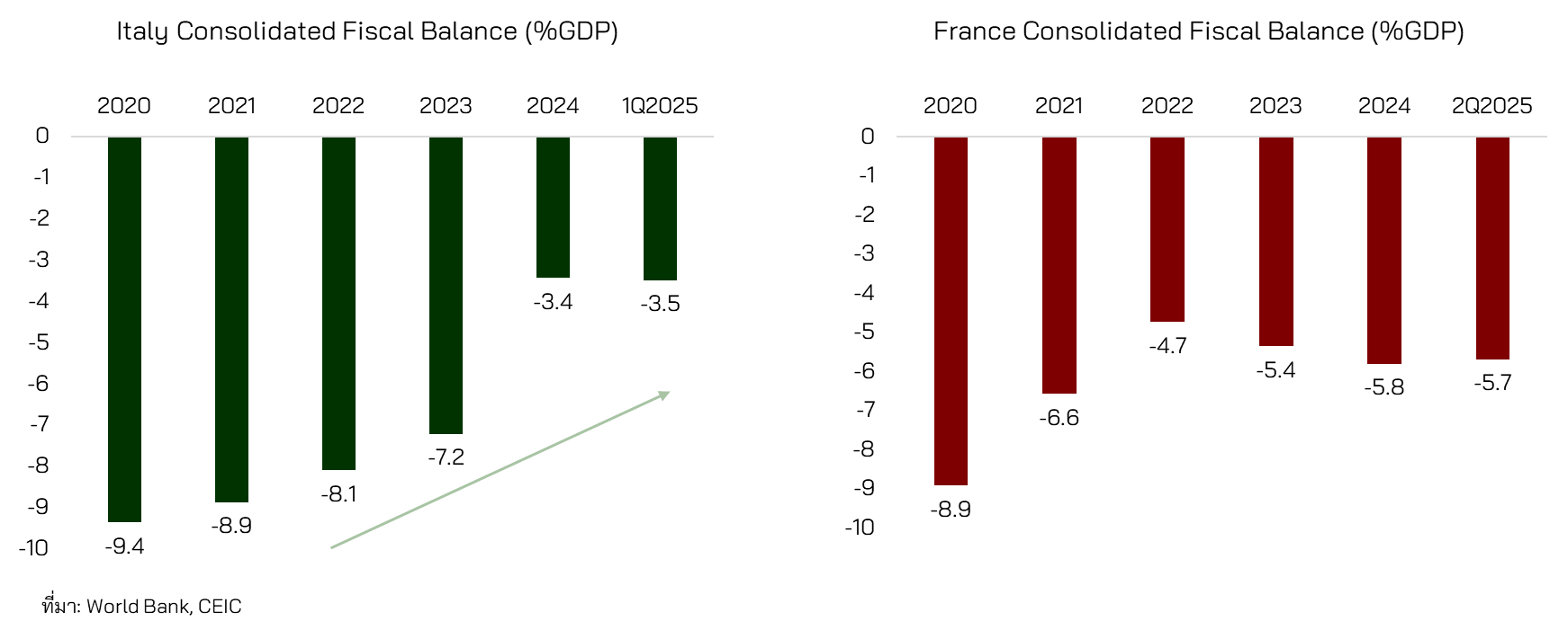 รูปที่ 7 อิตาลีสามารถลดการขาดดุลการคลังได้ ขณะที่ฝรั่งเศสทรงตัวในระดับสูง