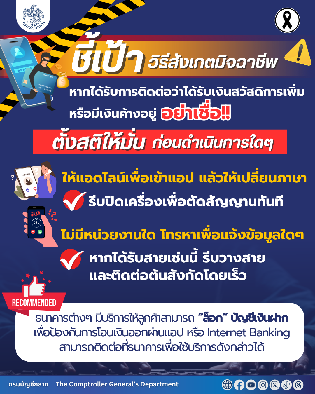 “ปัจจุบันธนาคารต่าง ๆ มีบริการที่ให้ลูกค้าสามารถ “ล็อก” บัญชีเงินฝากของตนเอง เพื่อป้องกันการโอนเงินออกผ่านช่องทางดิจิทัล (แอปพลิเคชันหรืออินเทอร์เน็ตแบงกิ้ง) โดยมิจฉาชีพทำให้เงินในบัญชีไม่สามารถถูกขโมยไปได้ง่าย แม้จะถูกหลอกให้กดลิงก์หรือให้ข้อมูลไปแล้วก็ตาม และจะทำธุรกรรมขาออกได้เฉพาะที่สาขาหรือตู้ ATM เท่านั้น (ขึ้นอยู่กับเงื่อนไขธนาคาร) เพื่อเพิ่มความปลอดภัยสูงสุด สามารถติดต่อที่ธนาคารเพื่อใช้บริการดังกล่าวได้ ทั้งนี้ กรมบัญชีกลางขอย้ำว่า ไม่มีนโยบายให้เจ้าหน้าที่ติดต่อผู้รับบำนาญหรือทายาท เพื่อให้ดำเนินการใด ๆ ทั้งสิ้น และขอให้ติดตามข่าวสารจากกรมบัญชีกลางอย่างใกล้ชิด จากช่องทางของกรมบัญชีกลาง ได้แก่ เว็บไซต์กรมบัญชีกลาง www.cgd.go.th และสื่อโซเชียลของกรมบัญชีกลางที่มีเครื่องหมายถูก (Verified) เท่านั้น หากมีข้อสงสัยหรือได้รับการติดต่อที่ไม่มั่นใจว่ามาจากกรมบัญชีกลางจริงหรือไม่ สามารถสอบถามโดยตรงได้ที่ Call Center กรมบัญชีกลาง หมายเลข 0 2270 6400 ในวัน เวลาราชการ” อธิบดีกรมบัญชีกลางกล่าว