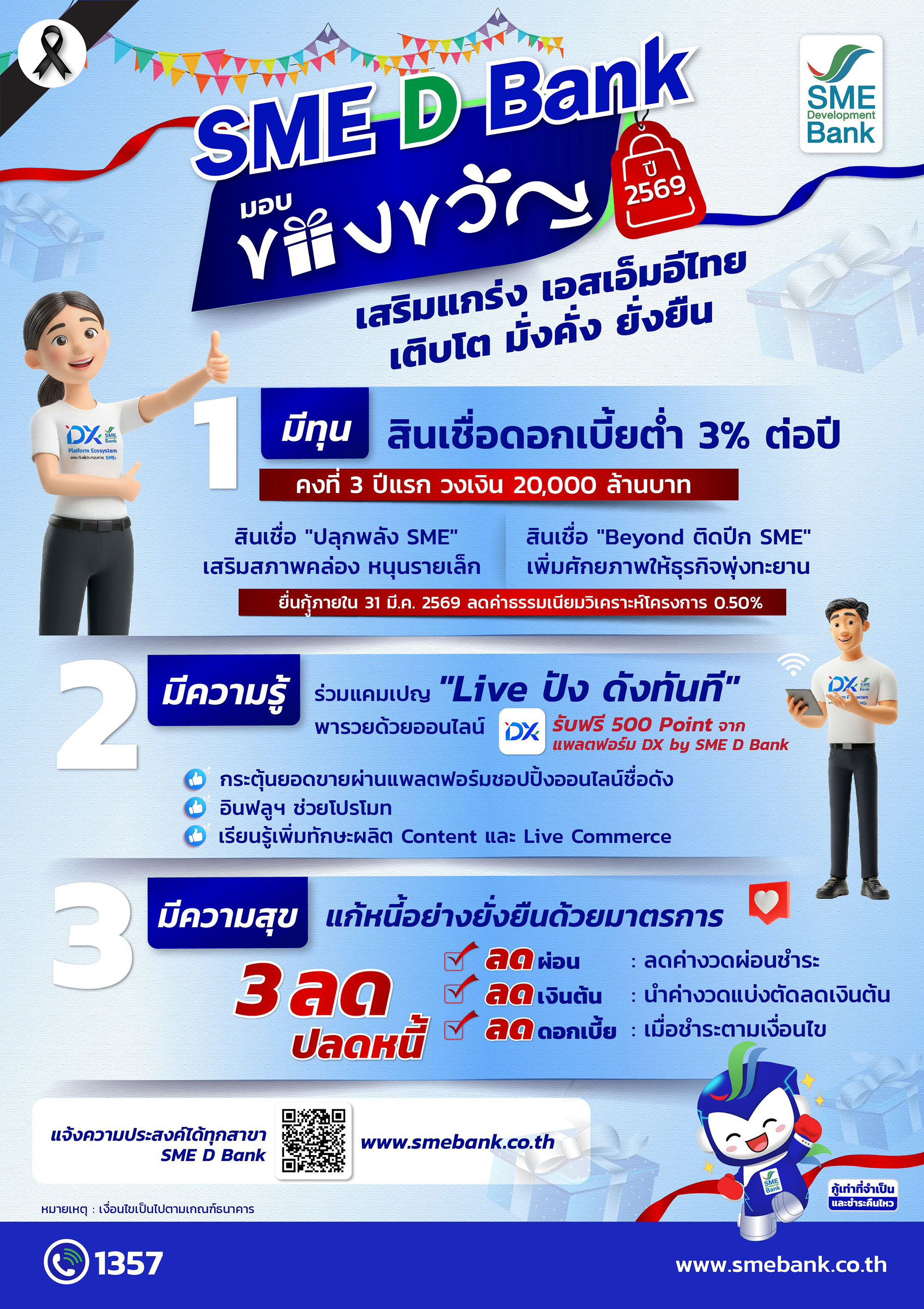 SME D Bank จัดชุดของขวัญปีใหม่ 2569 เพื่อเอสเอ็มอีไทย สร้างความสุข สนับสนุนธุรกิจเติบโตเข้มแข็งยั่งยืน ได้แก่  1. เติมทุนสินเชื่อดอกเบี้ยต่ำพิเศษเพียง 3% ต่อปี คงที่ตลอด 3 ปีแรก วงเงินรวม 20,000 ล้านบาท แถมยื่นกู้ภายใน 31 มี.ค. 69 ลดค่าธรรมเนียมวิเคราะห์โครงการ 0.50%  2. เสริมทักษะ เพิ่มรายได้ด้วยตลาดออนไลน์ และ 3.ช่วยแก้หนี้ยั่งยืน คืนความสุข สร้างโอกาสพลิกฟื้นธุรกิจเดินหน้าได้ดีอีกครั้ง