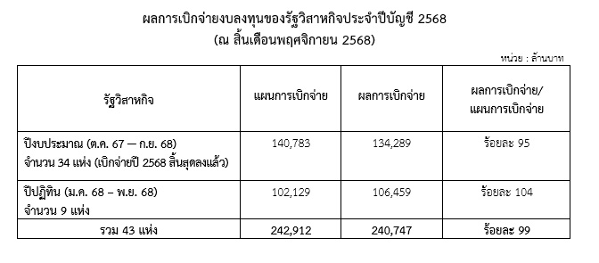 นายธิบดี วัฒนกุล ผู้อำนวยการสำนักงานคณะกรรมการนโยบายรัฐวิสาหกิจ (สคร.) เปิดเผยว่า การเบิกจ่ายงบลงทุนของรัฐวิสาหกิจที่อยู่ในกำกับของ สคร. จำนวน 43 แห่ง ได้แก่ รัฐวิสาหกิจที่ใช้ปีบัญชีตามปีงบประมาณ (รัฐวิสาหกิจปีงบประมาณ) จำนวน 34 แห่ง และรัฐวิสาหกิจที่ใช้ปีบัญชีตามปีปฏิทิน (รัฐวิสาหกิจปีปฏิทิน) จำนวน 9 แห่ง มีการเบิกจ่ายงบลงทุนจนถึงเดือนพฤศจิกายน 2568 แล้วจำนวน 240,747 ล้านบาท หรือคิดเป็นร้อยละ 99 ของแผนการเบิกจ่าย แยกเป็นการเบิกจ่ายงบลงทุนของรัฐวิสาหกิจปีงบประมาณ (ตั้งแต่เดือนตุลาคม 2567 - เดือนกันยายน 2568) ซึ่งได้สิ้นสุดการเบิกจ่ายงบลงทุนประจำปีบัญชี 2568 แล้วจำนวน 134,289 ล้านบาท หรือคิดเป็นร้อยละ 95 ของแผนการเบิกจ่าย และรัฐวิสาหกิจปีปฏิทิน (เดือนมกราคม 2568 - เดือนพฤศจิกายน 2568) จำนวน 106,459 ล้านบาท หรือคิดเป็นร้อยละ 104 ของแผนการเบิกจ่าย ทั้งนี้ รัฐวิสาหกิจปีงบประมาณที่เบิกจ่ายได้ไม่ต่ำกว่าร้อยละ 95 ของแผนการเบิกจ่ายและมีมูลค่าสูงสุด 3 อันดับ ได้แก่ การรถไฟแห่งประเทศไทย (รฟท.) การรถไฟฟ้าขนส่งมวลชนแห่งประเทศไทย (รฟม.) และการประปานครหลวง (กปน.) สำหรับรัฐวิสาหกิจปีปฏิทินที่เบิกจ่ายได้ไม่ต่ำกว่าร้อยละ 95 ของแผนการเบิกจ่ายและมีมูลค่าสูงสุด3 อันดับ ได้แก่ การไฟฟ้าส่วนภูมิภาค การไฟฟ้าฝ่ายผลิตแห่งประเทศไทย และการไฟฟ้านครหลวง