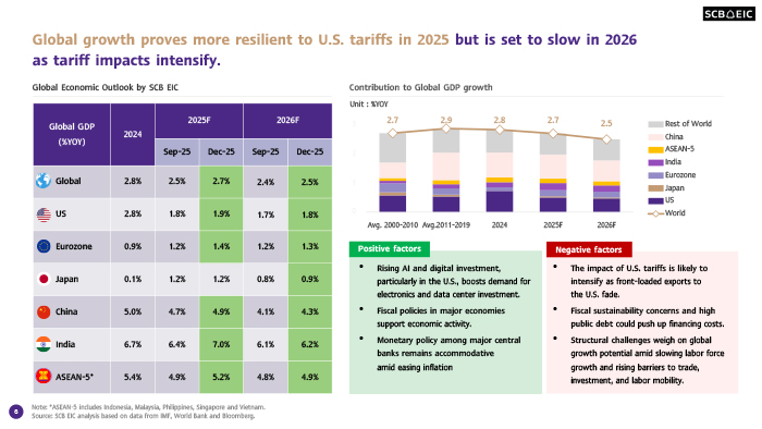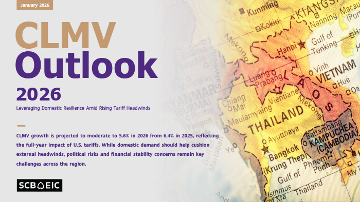 • เศรษฐกิจ CLMV ในปี 2569 มีแนวโน้มชะลอลง โดย SCB EIC ประเมินว่าเศรษฐกิจกลุ่มประเทศ CLMV จะขยายตัว 5.6% ในปี 2569 ลดลงจาก 6.4% ในปี 2568 สะท้อนผลกระทบจากการปรับขึ้นภาษีนำเข้าของสหรัฐฯ ตลอดทั้งปีและการชะลอตัวของเศรษฐกิจโลก
