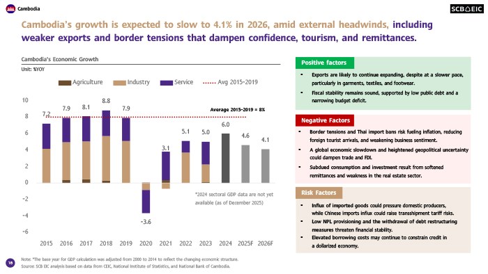 เศรษฐกิจกัมพูชามีแนวโน้มชะลอลง ตามการส่งออกสินค้าโดยเฉพาะในตลาดสหรัฐฯ อีกทั้งยังเผชิญแรงกดดันจากการแข่งขันที่รุนแรงขึ้นจากสินค้าจีนนำเข้า ความตึงเครียดบริเวณชายแดนที่ลดทอนความเชื่อมั่นของนักลงทุน จำนวนนักท่องเที่ยวที่ลดลงจากความกังวลด้านความปลอดภัย และเงินโอนกลับประเทศที่ลดลงจากแรงงานกัมพูชาที่เดินทางกลับจากไทย แม้เสถียรภาพด้านการคลังยังอยู่ในเกณฑ์ดี แต่รายได้ภาครัฐที่จำกัดและหนี้ต่างประเทศที่อยู่ในระดับสูงอาจจำกัดขีดความสามารถในการดำเนินนโยบายการคลังเพื่อพยุงเศรษฐกิจ