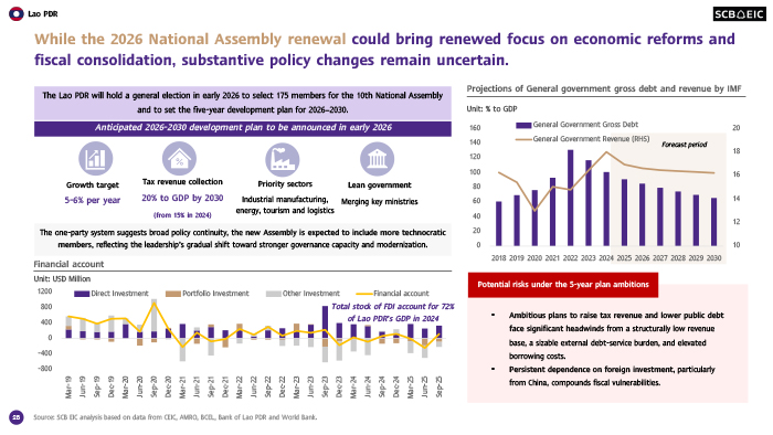 เศรษฐกิจ สปป.ลาว มีแนวโน้มเติบโตต่อเนื่องในอัตราที่ชะลอลงบ้าง จากเสถียรภาพทางเศรษฐกิจที่ทยอยปรับดีขึ้น ทั้งอัตราเงินเฟ้อที่ชะลอลงและเงินกีบที่มีเสถียรภาพมากขึ้น ขณะที่ผลกระทบจากมาตรการภาษีนำเข้าของสหรัฐฯ มีจำกัด เนื่องจากพึ่งพาตลาดสหรัฐฯ ในระดับต่ำ อย่างไรก็ดี ความเสี่ยงด้านต่ำยังคงกดดันเศรษฐกิจ โดยเฉพาะหนี้ของรัฐวิสาหกิจ (SOEs) ที่อยู่ในระดับสูง และขีดความสามารถในการรองรับแรงกดดันเพิ่มเติมจากภายนอกที่มีจำกัด