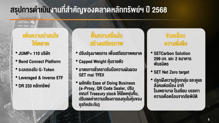 • ชู 3 กลยุทธ์หลัก จับมือทุกภาคส่วน ขับเคลื่อนตลาดทุนไทย ปลดล็อกอุปสรรค ผลักดันให้เกิดการเติบโตภายใต้ภาวะตลาดชะลอตัวและปัจจัยความผันผวนรอบด้าน