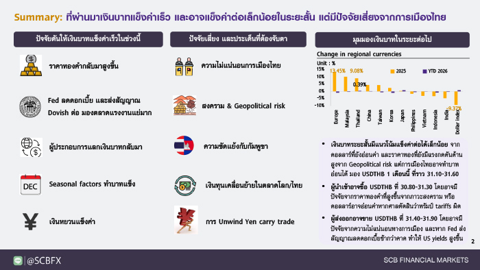 นายแพททริก ปูเลีย รองผู้จัดการใหญ่ Head of Financial Markets Function ธนาคารไทยพาณิชย์ จำกัด (มหาชน) เปิดเผยว่าตั้งแต่เปิดปีใหม่มา เงินบาทผันผวนมากขึ้น โดยในช่วงสัปดาห์แรกพบว่าเงินบาทแข็งค่าเร็วตามราคาทองคำที่ปรับสูงขึ้นแรง หลังเกิดความตึงเครียดทางภูมิรัฐศาสตร์และเหตุการณ์ความไม่สงบในต่างประเทศ ทั้งเวเนซุเอลา และอิหร่าน อีกทั้งเงินทุนเคลื่อนย้ายยังไหลเข้าตลาดบอนด์ไทยต่อเนื่องจากปีที่แล้ว ก็เป็นอีกปัจจัยที่ดันให้เงินบาทแข็งค่าขึ้นมา อย่างไรก็ดี หลังมีการให้สัมภาษณ์เกี่ยวกับแนวทางการดำเนินนโยบายในตลาดการเงินของไทย เช่น โอกาสการลดดอกเบี้ยในระยะข้างหน้า รวมถึงโอกาสที่จะปรับกฎเกณฑ์ควบคุมการทำธุรกรรมซื้อ/ขายทองคำ โดยเฉพาะในแพลตฟอร์มออนไลน์ จึงทำให้เงินบาทกลับมาอ่อนค่าเร็ว