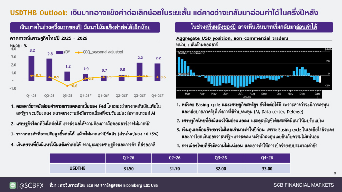 สำหรับในระยะยาว เงินบาทอาจกลับมาอ่อนค่าได้ มองกรอบปลายปีที่ราว 32.00-33.00 บาทต่อดอลลาร์ ปัจจัยที่อาจทำให้เงินบาทอ่อนค่ามาจาก 1) หลังจบ Easing cycle และเศรษฐกิจสหรัฐฯ ยังโตต่อได้ดีจากการลงทุนและนโยบายภาครัฐที่เร่งการใช้จ่าย/ลงทุน (AI, Data center, Defense) ซึ่งจะดันให้เงินดอลลาร์กลับมาแข็งค่าได้ 2) เศรษฐกิจไทยที่ยังมีแนวโน้มอ่อนแอลง และดุลบัญชีเดินสะพัดมีแนวโน้มปรับแย่ลงตามการส่งออกที่อาจหดตัวได้ในปีนี้ 3) เงินทุนเคลื่อนย้ายอาจไม่ไหลเข้ามาเท่าในปีก่อน เพราะ Easing cycle ในเอเชียใกล้จบลง และการโยกเงินออกจากสหรัฐฯ อาจลดลง หลังนักลงทุนเคยชินกับความไม่แน่นอนของนโยบายทรัมป์ และ 4) การเมืองไทยที่ยังมีความไม่แน่นอน และอาจทำให้การเบิกจ่ายงบประมาณล่าช้า
