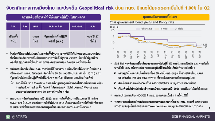 นายวชิรวัฒน์ บานชื่น นักกลยุทธ์ตลาดการเงินอาวุโส ธนาคารไทยพาณิชย์ จำกัด (มหาชน) เปิดเผยว่า ในช่วงที่มีความไม่แน่นอนในการจัดตั้งรัฐบาล อาจทำให้มีเงินไหลออกและบาทอ่อนค่าได้ในบางช่วง โดยผลต่อเงินบาทจะขึ้นอยู่กับระยะเวลาการจัดตั้งรัฐบาล หากการเลือกตั้งไม่ถูกเลื่อนออกไป รัฐบาลจัดตั้งได้เร็ว เงินบาทอาจอ่อนค่าเพียงเล็กน้อยและในช่วงสั้น อย่างไรก็ดี หาก Timeline การจัดตั้งรัฐบาลถูกเลื่อนออกไปจากที่ประเมิน หรือมีการประท้วงการเลือกตั้ง ก็อาจทำให้บาทอ่อนค่าเร็วได้ โดยกรณี Worst case บาทอาจอ่อนค่ามากกว่า 30-40 สตางค์ภายใน 1 วันได้ สำหรับกระบวนการจัดทำงบประมาณปี 2027 นายวชิรวัฒน์ มองว่าหากการจัดตั้งรัฐบาลเป็นไปตาม Timeline พ.ร.บ. งบฯ ปี 2027 อาจประกาศล่าช้า 1-2 เดือน ขณะที่การเร่งรัดเบิกจ่ายงบฯ ปี 2026 จะทำให้ผลกระทบต่อเศรษฐกิจไทยและตลาดการเงินอาจไม่มากนัก อย่างไรก็ดี หากการจัดตั้งรัฐบาลมีความล่าช้า ส่งผลต่อการจัดทำงบฯ ปี 2027 ก็อาจส่งผลเสียต่อเศรษฐกิจไทยและค่าเงินในช่วงครึ่งปีหลังได้