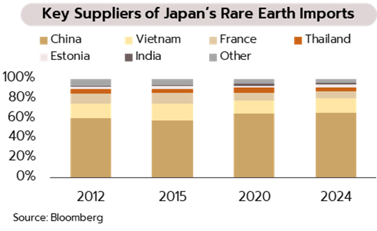 ญี่ปุ่น: สถานการณ์ทางการเมืองของญี่ปุ่นก้าวสู่จุดเปลี่ยนสำคัญ หลังรัฐบาลประกาศว่ามีแผนจะยุบสภาในสัปดาห์นี้โดยคาดว่าจะนำไปสู่การเลือกตั้งในวันที่ 8 กุมภาพันธ์ การเคลื่อนไหวอาจเป็นกลยุทธ์เพื่อขยายฐานที่นั่งในสภาผู้แทนราษฎรเพื่อให้รัฐบาลมีเสถียรภาพมากขึ้น โดยอาศัยจังหวะที่รัฐบาลยังมีคะแนนนิยมสูงถึง 70% อย่างไรก็ตาม ยังมีความเสี่ยงจากภายในและภายนอกประเทศ (i) การรวมตัวกันตั้งพรรคใหม่ของฝ่ายค้านในการชิงที่นั่งในสภาฯ (ii) ความขัดแย้งกับจีนเรื่องไต้หวันหลังจีนประกาศจำกัดการส่งออกสินค้าที่ใช้ได้สองทาง (Dual-use) เช่น โดรน ระบบนำทาง รวมถึงแร่หายากบางชนิด ประเด็นดังกล่าวคาดว่าจะมีผลกระทบต่ออุตสาหกรรมป้องกันประเทศของญี่ปุ่น รวมถึงภาคธุรกิจอิเล็กทรอนิกส์ ยานยนต์ ที่พึ่งพาวัตถุดิบจีน โดยข้อมูลในปี 2567 บ่งชี้ว่าญี่ปุ่นพึ่งพาการนำเข้าแร่หายากจากจีนสูงถึง 70%