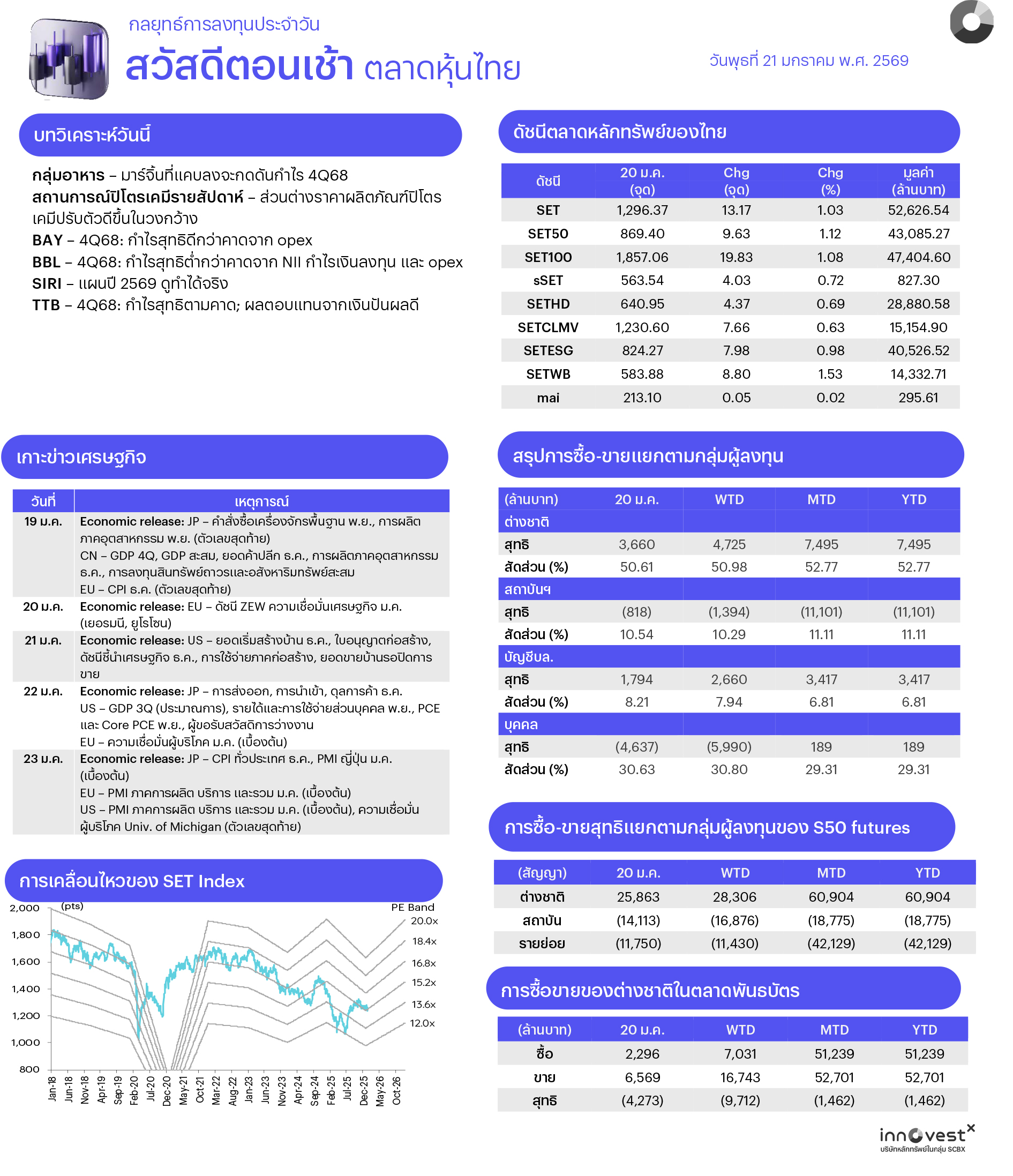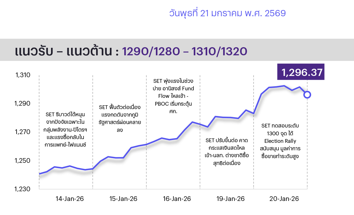 ช่วงสั้นมอง SET แกว่งตัวในกรอบ 1250–1320 จุด โดยปัจจัยในประเทศติดตามการประกาศงบ 4Q68 ของกลุ่มธนาคารขนาดใหญ่ซึ่งจะออกมาครบในสัปดาห์หน้านี้, นโยบายหาเสียงด้านเศรษฐกิจของพรรคการเมืองซึ่งจะมีผลต่ออุตสาหกรรมและหุ้นที่เกี่ยวข้อง ส่วนปัจจัยภายนอกที่ต้องติดตาม ได้แก่ ความเสี่ยงทางด้านภูมิรัฐศาสตร์ในตะวันออกลาง (เวเนซุเอลา, อิหร่าน, รัสเซีย-ยูเครน) ซึ่งจะมีผลต่อความผันผวนของราคาน้ำมันและหุ้นกลุ่มพลังงาน, ความคืบหน้าการเจรจาทางการเมืองระหว่างสหรัฐฯ เดนมาร์ก และกรีนแลนด์ รวมทั้งข้อมูลเศรษฐกิจสำคัญ อาทิ GDP 4Q68 และยอดค้าปลีกของจีน, PCE พ.ย. และ GDP 3Q68 (รายงานครั้งสุดท้าย) ของสหรัฐฯ ซึ่งจะมีผลต่อการกำหนดทิศทางการดำเนินนโยบายทางเศรษฐกิจ ดังนั้นกลยุทธ์การลงทุนจึงแนะนำ “Selective Buy”