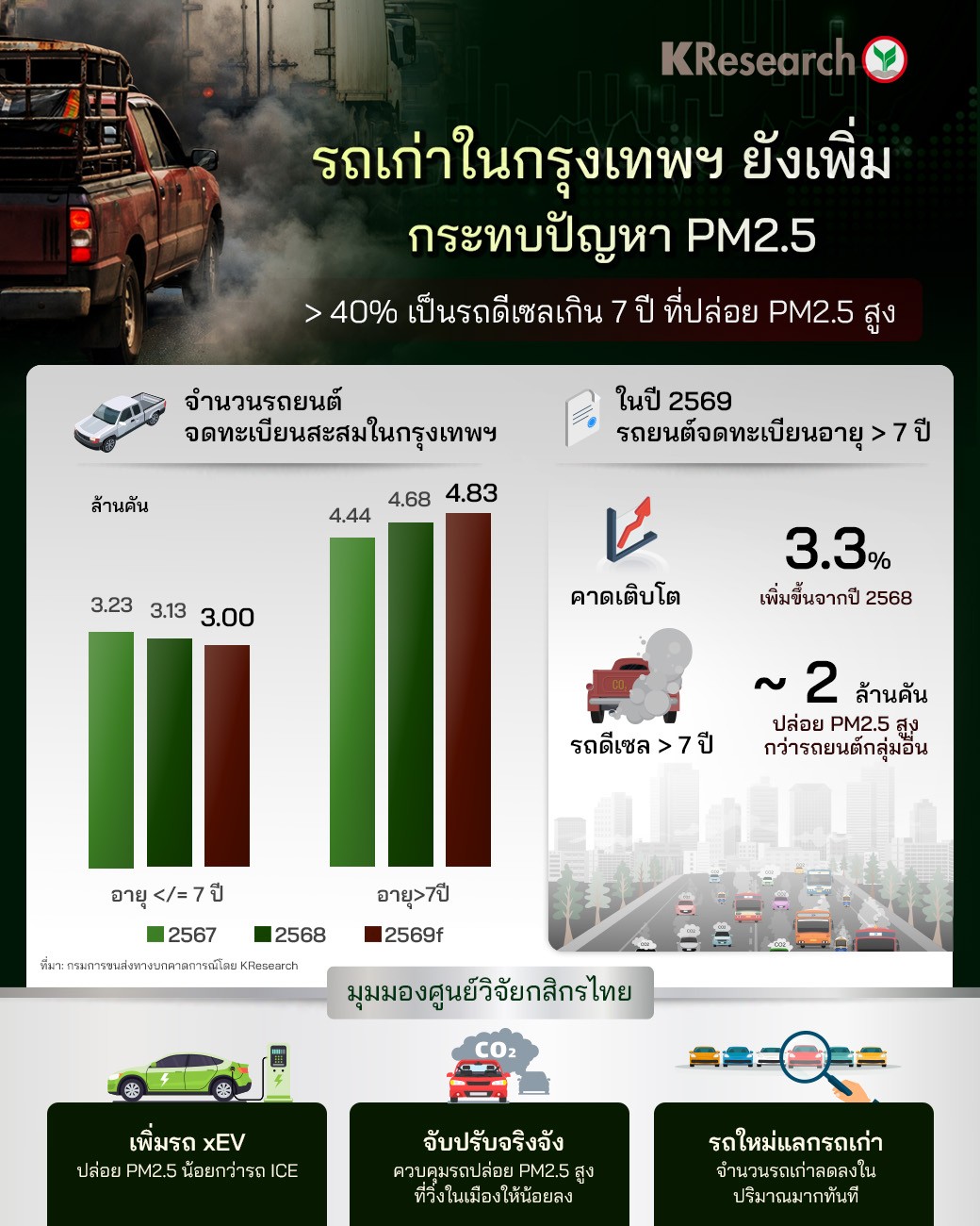• ปัญหา PM2.5 ยังคงเป็นปัญหากระทบสุขภาพหลักที่วนกลับมาทุกปี ซึ่งสาเหตุหลักหนึ่งของปัญหา PM2.5 ใน กทม. คือ การปล่อยไอเสียจากรถยนต์ โดยเฉพาะรถยนต์เก่าที่มีอายุเกิน 7 ปี ที่ในปี 2569 คาดยังมีปริมาณเพิ่มขึ้นใน กทม. 3.3% คิดเป็นรถยนต์เก่าประมาณ 4.83 ล้านคัน โดยในจำนวนนี้ประมาณ 2 ล้านคัน เป็นรถยนต์ดีเซลเก่าที่ปล่อย PM2.5 สูงกว่ารถยนต์กลุ่มอื่น