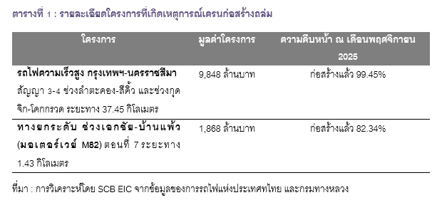 เหตุการณ์เครนก่อสร้างถล่มติดต่อกัน กระทบต่อความเชื่อมั่นด้านความปลอดภัยของการก่อสร้างโครงการภาครัฐในวงกว้าง เหตุการณ์เครนก่อสร้างถล่มติดต่อกันในเดือนมกราคม 2026 ได้แก่ 1) เครนก่อสร้างโครงการรถไฟความเร็วสูงกรุงเทพฯ-นครราชสีมา ถล่มทับขบวนรถไฟด่วนพิเศษหมายเลข 21 เส้นทางสถานีกลางกรุงเทพอภิวัฒน์-อุบลราชธานี และ 2) เครนก่อสร้างโครงการทางยกระดับ ช่วงเอกชัย-บ้านแพ้ว (มอเตอร์เวย์ M82) ถล่มทับรถยนต์ อีกทั้ง เหตุการณ์อาคารสำนักงานตรวจเงินแผ่นดินแห่งใหม่ที่อยู่ระหว่างการก่อสร้างพังถล่มจากแผ่นดินไหวเมื่อปี 2025 รวมถึงถนนที่ก่อสร้างแล้ว และอยู่ระหว่างก่อสร้างทรุดตัวในหลายพื้นที่ ที่เกิดขึ้นอย่างต่อเนื่อง กระทบต่อความเชื่อมั่นด้านความปลอดภัยของการก่อสร้างโครงการภาครัฐในวงกว้างการแก้ปัญหาเชิงโครงสร้าง ทั้งการยกระดับกลไกการกำกับดูแลผู้รับเหมาก่อสร้าง และการนำเทคโนโลยีก่อสร้างมาใช้ จะช่วยสร้างความปลอดภัยให้กับการก่อสร้าง