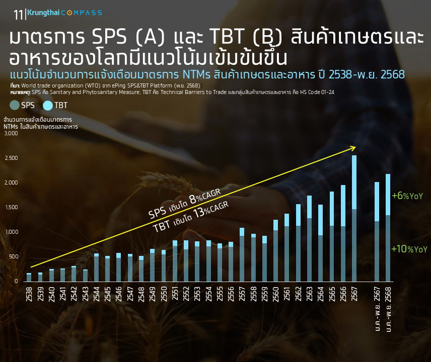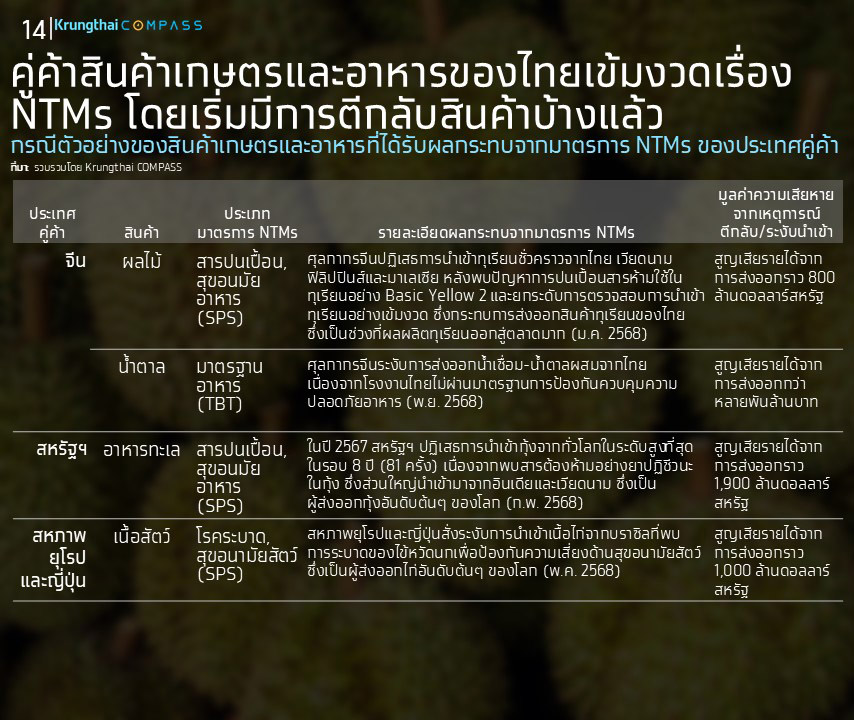 ศูนย์วิจัย Krungthai COMPASS ชี้ มาตรการทางการค้าที่มิใช่ภาษี (Non-Tariff Measures: NTMs) กำลังเป็นอุปสรรคสำคัญในการค้าโลก โดยเฉพาะในกลุ่มสินค้าเกษตรและอาหาร ซึ่งคาดว่าจะกระทบตลาดส่งออกไทยกว่า 6 แสนล้านบาท หรือคิดเป็นราว 33% ของมูลค่าส่งออกสินค้าเกษตรและอาหารทั้งหมดของไทย แนะผู้ประกอบการ 3 กลุ่มหลัก ได้แก่ เนื้อสัตว์แปรรูป อาหารทะเลแปรรูป และผักและผลไม้ เร่งยกระดับมาตรฐานด้านสุขอนามัย เช่น การปนเปื้อนสารเคมีและสารตกค้าง อย่างจริงจัง และนำเทคโนโลยีดิจิทัลมาใช้ตรวจสอบย้อนกลับ เพื่อเพิ่มขีดความสามารถในการแข่งขันในตลาดโลก
