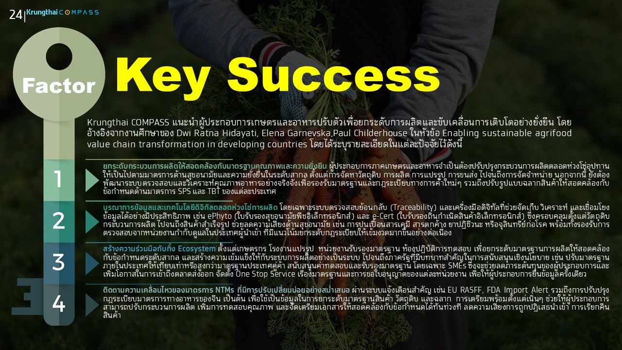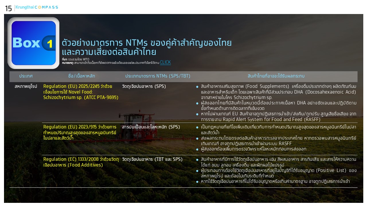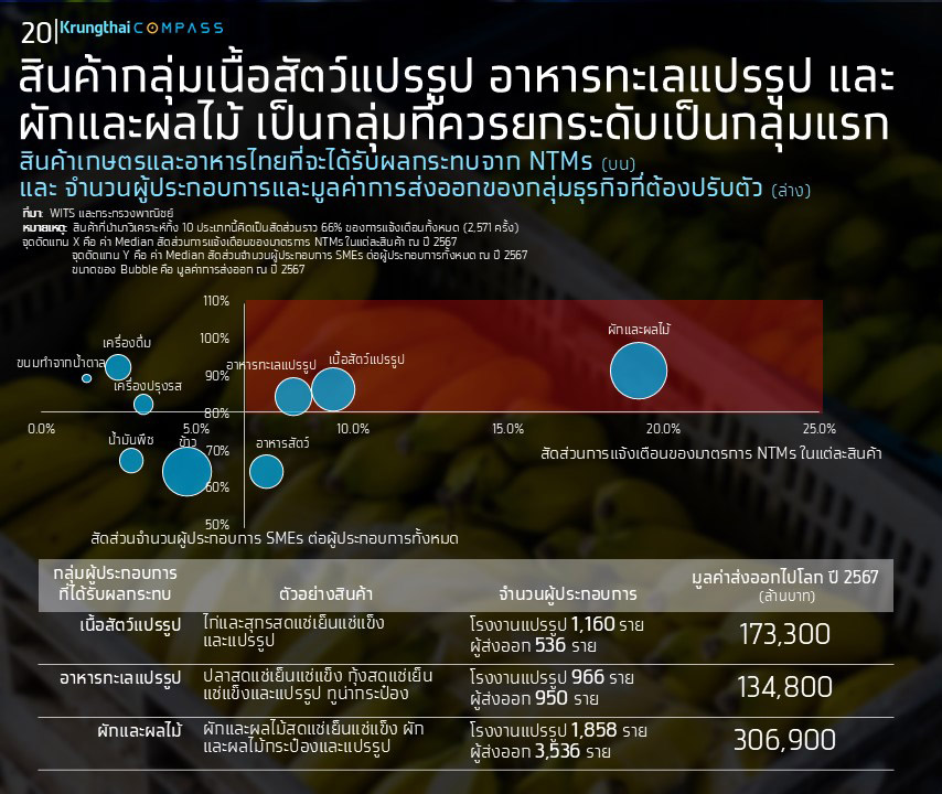 “สินค้าเกษตรและอาหารที่อยู่ในกลุ่มที่มีความเสี่ยงสูงและจำเป็นต้องยกระดับมาตรฐานเพื่อให้สอดคล้องกับ NTMs ของประเทศคู่ค้า ได้แก่ สินค้าในกลุ่มเนื้อสัตว์แปรรูป อาหารทะเลแปรรูป และผักและผลไม้ เนื่องจากเป็นกลุ่มที่มีความเสี่ยงจากการแจ้งเตือนมาตรการ NTMs ทั่วโลกในสัดส่วนสูง และมีผู้ประกอบการ SMEs อยู่เป็นจำนวนมาก โดยสินค้าในกลุ่มที่กล่าวมาข้างต้น มีมูลค่าการส่งออกไปตลาดโลกรวมกันถึง 6 แสนล้านบาทต่อปี หรือคิดเป็นราว 33% ของมูลค่าส่งออกสินค้าเกษตรและอาหารรวมของไทย ซึ่งอยู่ที่กว่า 1.8 ล้านล้านบาทต่อปี”