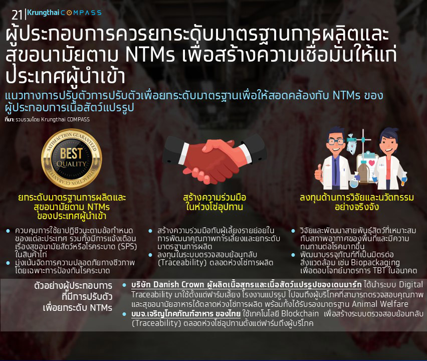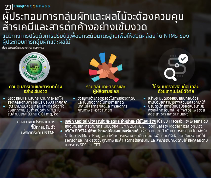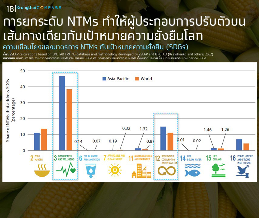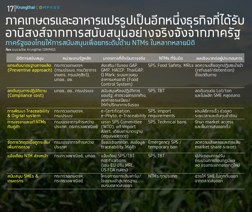 นายปราโมทย์ วัฒนานุสาร นักวิเคราะห์ ศูนย์วิจัย Krungthai COMPASS กล่าวเสริมว่า ธุรกิจเกษตรและอาหารไทยจำเป็นต้องเร่งปรับตัว เนื่องจากความตระหนักด้านสุขอนามัยของผู้บริโภคที่เพิ่มขึ้น เป็นแรงกดดันให้คู่ค้าเข้มงวดมาตรการ NTMs มากขึ้น ประกอบกับภาครัฐให้การสนับสนุนภาคเกษตรและอาหารแปรรูปที่มุ่งยกระดับมาตรฐานการผลิตและพัฒนาระบบตรวจสอบย้อนกลับอย่างจริงจัง นอกจากนี้ การยกระดับ NTMs ทำให้ทิศทางธุรกิจสอดคล้องกับความยั่งยืนโลก โดยมาตรการ NTMs เชื่อมโยงกับการบรรลุเป้าหมาย SDGs โดยเฉพาะในด้านการมีสุขภาพและความเป็นอยู่ที่ดี (SDG 3) และการผลิตและบริโภคที่ยั่งยื่น (SDG 12) ซึ่งจะกลายเป็นกรอบสำคัญที่ผู้ประกอบการเกษตรและอาหารไทยหลีกเลี่ยงไม่ได้ในระยะต่อไป