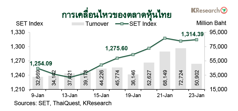 · สัปดาห์ถัดไป (26-30 ม.ค. 69) บริษัทหลักทรัพย์กสิกรไทย จำกัด มองว่า ดัชนีหุ้นไทยมีแนวรับที่ 1,300 และ 1,285 จุด ขณะที่แนวต้านอยู่ที่ 1,330 และ 1,345 จุด ตามลำดับ โดยศูนย์วิจัยกสิกรไทยประเมินปัจจัยสำคัญที่ต้องติดตาม ได้แก่ การประชุมเฟด (27-28 ม.ค.) ผลประกอบการไตรมาส 4/2568 ของบจ.ไทย และทิศทางเงินทุนต่างชาติ ส่วนข้อมูลเศรษฐกิจสหรัฐฯ ที่สำคัญ ได้แก่ ยอดสั่งซื้อสินค้าคงทน ดัชนีราคาที่อยู่อาศัยเดือนพ.ย. ดัชนีราคาผู้ผลิตเดือนธ.ค. รวมถึงจำนวนผู้ขอรับสวัสดิการว่างงานรายสัปดาห์ ขณะที่ปัจจัยเศรษฐกิจต่างประเทศอื่น ๆ ได้แก่ ตัวเลขจีดีพีไตรมาส 4/2568 ของยูโรโซน กำไรบริษัทภาคอุตสาหกรรมเดือนธ.ค. ของจีน รวมถึงผลผลิตภาคอุตสาหกรรมเดือนธ.ค. ของญี่ปุ่น