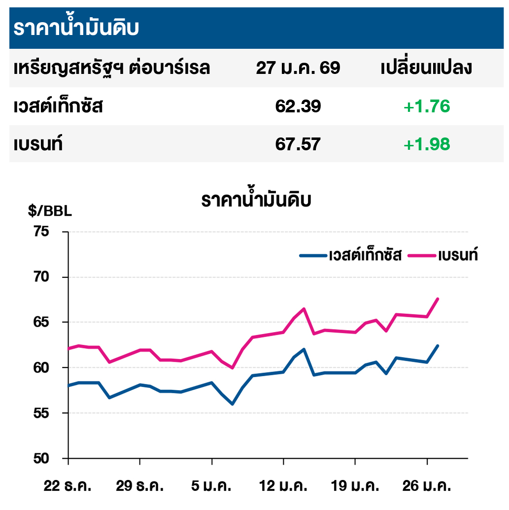 (+/-) ตลาดจับตาการประชุมคณะกรรมการกำหนดนโยบายการเงินของธนาคารกลางสหรัฐ (FOMC) ซึ่งจัดขึ้นในวันที่ 27-28 ม.ค. 68 โดยล่าสุด FedWatch Tool คาดการณ์ว่าธนาคารกลางสหรัฐฯ (เฟด) จะคงอัตราดอกเบี้ยนโยบายไว้ที่ระดับ 3.50-3.75% หลังตัวเลขเศรษฐกิจของสหรัฐฯ ซึ่งเปิดเผยในช่วงสัปดาห์ที่ผ่านมายังคงแข็งแกร่ง