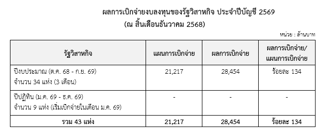 นางสาวปิยวรรณ ล่ามกิจจา ที่ปรึกษาด้านพัฒนารัฐวิสาหกิจ กล่าวเพิ่มเติมว่า สำหรับการเบิกจ่ายงบลงทุน ประจำปีบัญชี 2569 รัฐวิสาหกิจปีงบประมาณได้เริ่มการเบิกจ่ายมาตั้งแต่เดือนตุลาคม 2568 - เดือนธันวาคม 2568 มีผลการเบิกจ่ายสะสมแล้วจำนวน 28,454 ล้านบาท หรือร้อยละ 134 ของแผนการเบิกจ่ายสะสมรายเดือน ทั้งนี้ รัฐวิสาหกิจปีงบประมาณที่เบิกจ่ายได้ไม่ต่ำกว่าร้อยละ 95 ของแผนการเบิกจ่าย และมีมูลค่าสูงสุด 3 อันดับ ได้แก่ รฟท. รฟม. และ กปน.