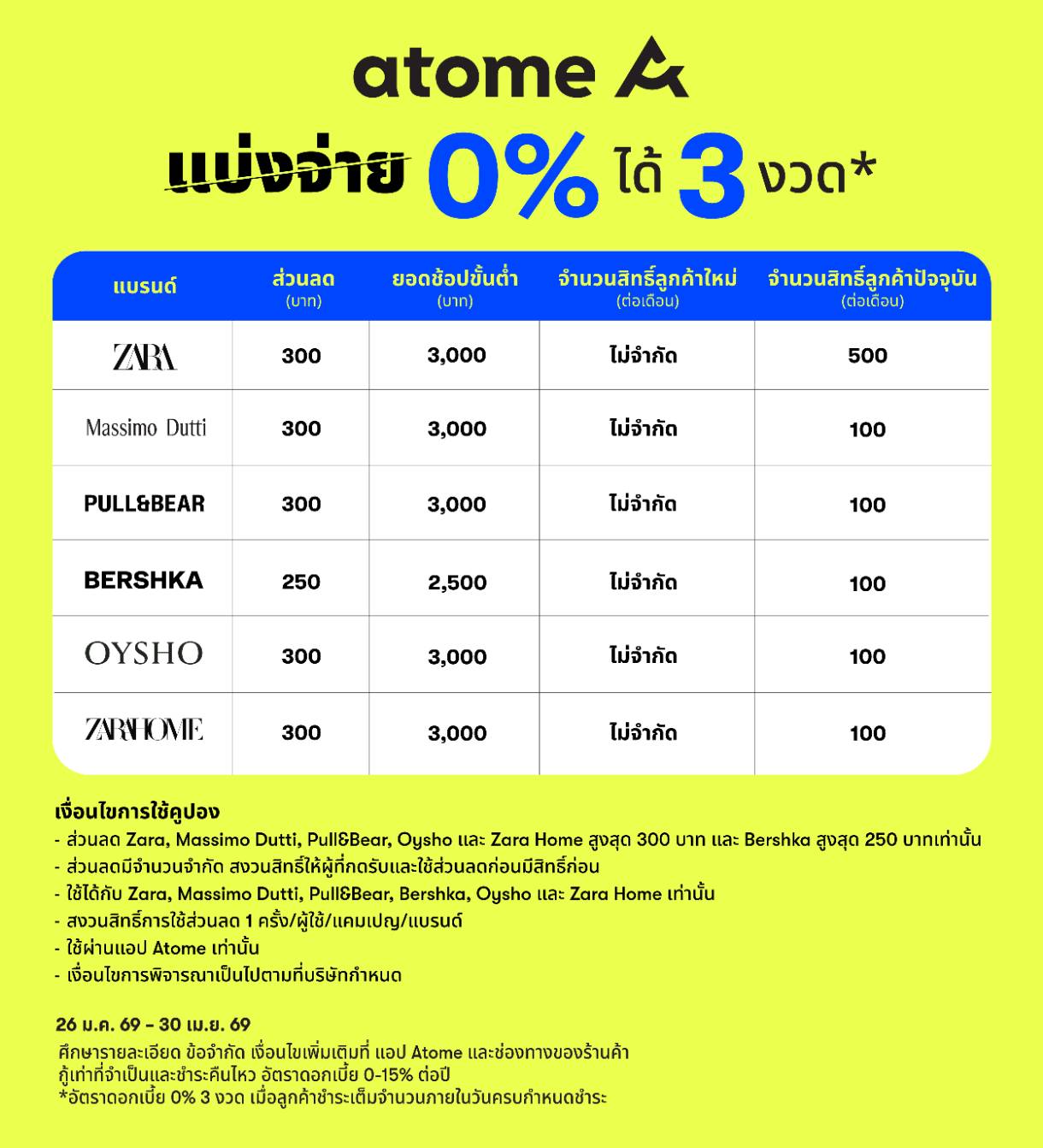นอกจากนี้ Atome ได้มอบส่วนลดพิเศษ เมื่อลูกค้าใช้บริการชำระเงินผ่าน Atome โดยรับส่วนลดจาก Zara, Massimo Dutti, Pull&Bear, Oysho และ Zara Home สูงสุด 300 บาท และ Bershka สูงสุด 250 บาท มีจำนวนจำกัด สงวนสิทธิ์ให้ผู้ที่กดรับและใช้ส่วนลดก่อนมีสิทธิ์ก่อน โดยสามารถใช้ส่วนลดได้ 1 ครั้ง/ผู้ใช้/แคมเปญ/แบรนด์ และรับสิทธิ์ผ่านแอปพลิเคชัน Atome เท่านั้น ตั้งแต่วันที่ 26 มกราคม 2569 – 30 เมษายน 2569