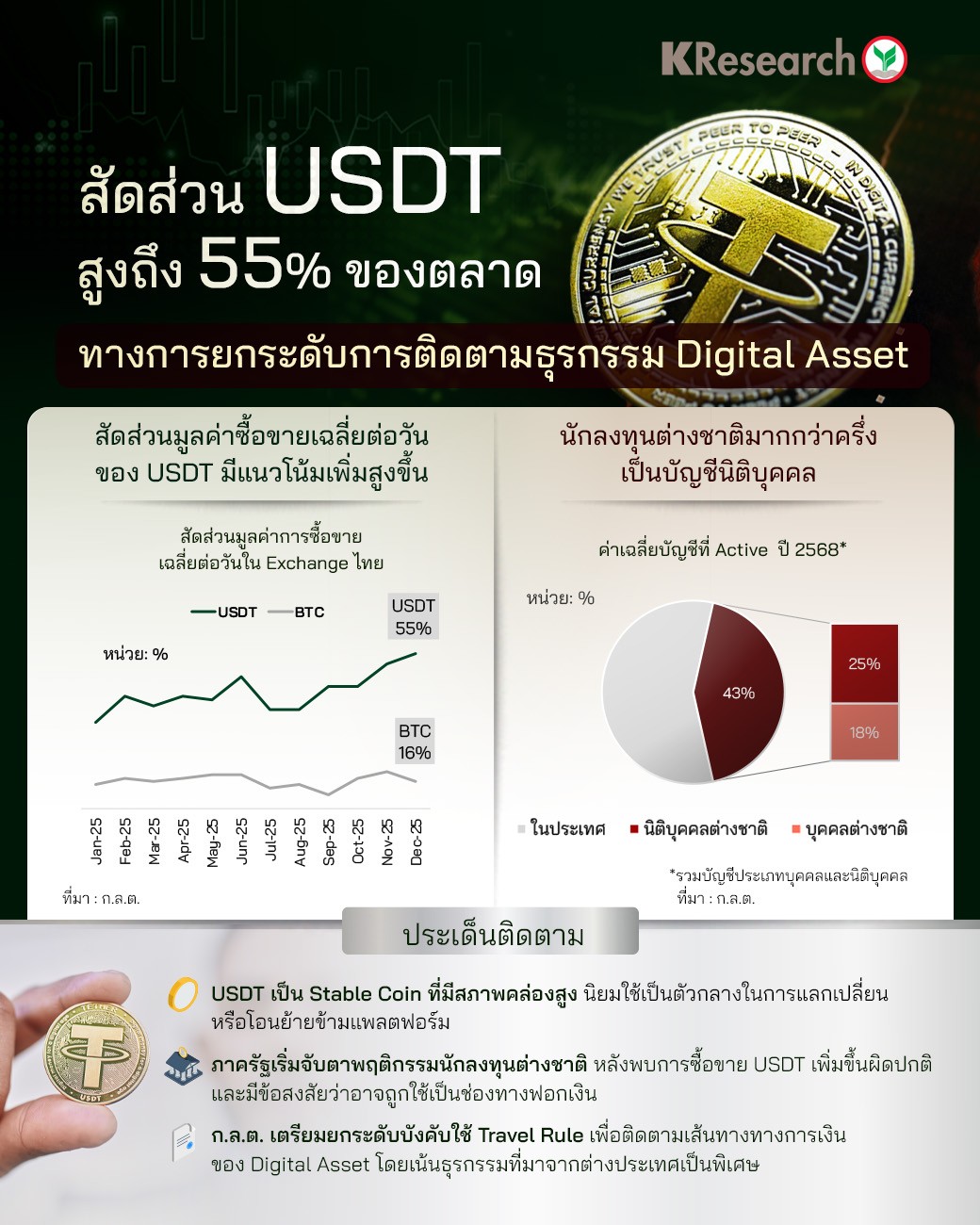 • ภาครัฐเริ่มจับตาพฤติกรรมนักลงทุนต่างชาติ หลังพบการซื้อขาย USDT เพิ่มขึ้นผิดปกติ และมีข้อสงสัยว่าอาจถูกใช้เป็นช่องทางฟอกเงิน