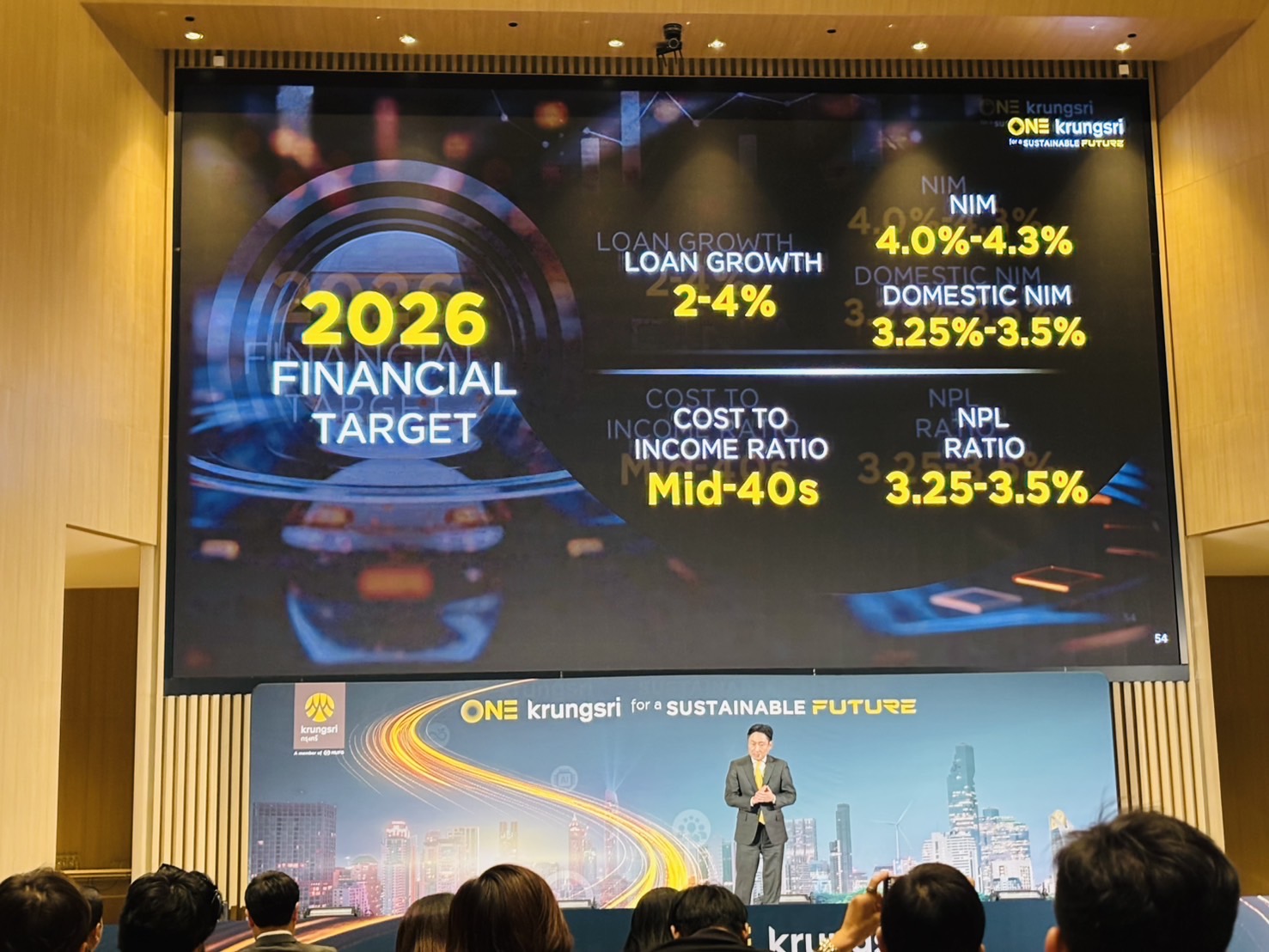 สำหรับปี 2569 กรุงศรีตั้งเป้าการเติบโตของสินเชื่อไว้ที่ 2–4% และส่วนต่างอัตราดอกเบี้ยสุทธิ (NIM) โดยรวมที่ 4.0–4.3% โดยที่ NIM ในประเทศอยู่ที่ 3.25–3.50% และอัตราส่วนค่าใช้จ่ายต่อรายได้อยู่ที่ระดับ Mid-40s% ควบคู่ไปกับการเดินหน้าพันธกิจด้านความยั่งยืนสู่เป้าหมาย Net Zero อย่างเป็นรูปธรรม ด้วยการปรับเพิ่มเป้าหมายพอร์ตการสนับสนุนทางการเงินให้แก่โครงการธุรกิจเพื่อสังคมและความยั่งยืน (Social and Sustainable Finance) เป็น 350,000 ล้านบาท พร้อมมุ่งมั่นพัฒนาโซลูชันทางการเงินเพื่อเสริมสร้างความแข็งแกร่งตลอดห่วงโซ่คุณค่าให้เติบโตได้อย่างยั่งยืนในระยะยาว
