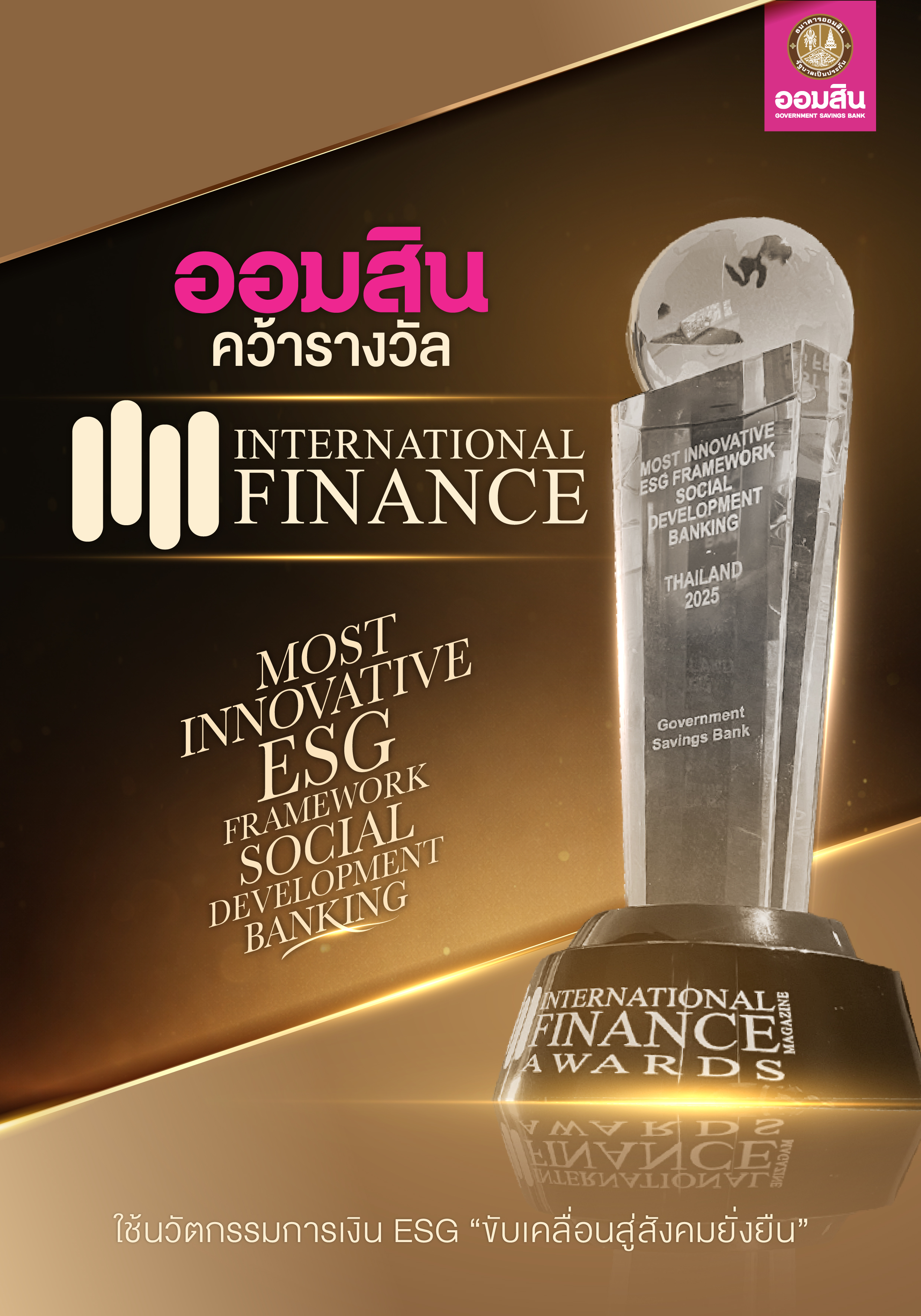 สำหรับ International Finance Awards เป็นรางวัลระดับนานาชาติที่มอบให้แก่องค์กรการเงินซึ่งมีความโดดเด่นและทันสมัยในด้านการดำเนินงานตามกรอบ ESG โดยพิจารณาจากความคิดริเริ่มเชิงนวัตกรรม การประยุกต์ใช้เทคโนโลยีเพื่อยกระดับประสิทธิภาพการดำเนินงาน ตลอดจนการให้ความสำคัญกับบทบาทในการพัฒนาสังคมอย่างยั่งยืน การได้รับรางวัลดังกล่าวจึงสะท้อนการยอมรับในระดับโลกต่อธนาคารออมสิน ในฐานะสถาบันการเงินที่นำนวัตกรรมและกรอบ ESG มาใช้เป็นกลไกขับเคลื่อนภารกิจธนาคารเพื่อสังคม และช่วยพัฒนาสังคมไทยสู่ความยั่งยืนอย่างเป็นรูปธรรม
