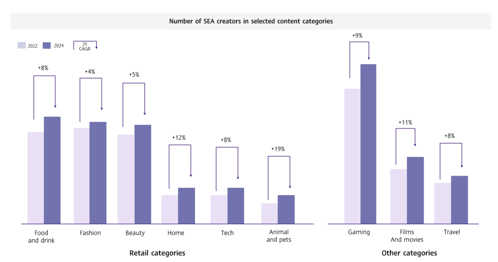 นอกจากหมวดที่เกี่ยวข้องกับค้าปลีกโดยตรงครีเอเตอร์หมวดอื่น ๆ ก็มีการเติบโตอย่างต่อเนื่องเช่นกัน โดยมีอัตราการเติบโตเฉลี่ยต่อปี (CAGR 2022-2024) ในแต่ละหมวด ดังนี้ เกมเติบโตที่ 11%, ภาพยนตร์และหนัง 9% และท่องเที่ยวที่ 8% โดยเฉพาะเกมที่มีตลาดขนาดใหญ่และกำลังเติบโตอย่างรวดเร็วในภูมิภาคเอเชียตะวันออกเฉียงใต้ ซึ่งไทยมีส่วนสำคัญทั้งในฐานะผู้เล่นและผู้สร้างคอนเทนต์เกม