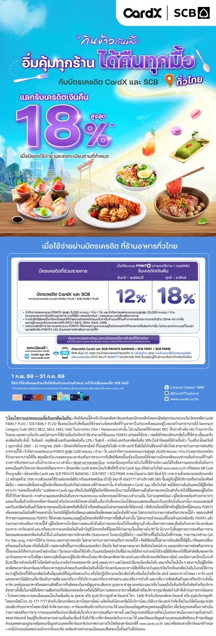 CardX ผู้ให้บริการบัตรเครดิตและสินเชื่อบุคคลภายใต้กลุ่มเอสซีบีเอกซ์ เดินหน้ากระตุ้นการจับจ่ายหมวดร้านอาหาร รับกระแสไลฟ์สไตล์คนไทยที่นิยมทานอาหารนอกบ้านและสังสรรค์มากขึ้น ผ่านแคมเปญ "กินข้าวกันมั๊ย อิ่มคุ้มทุกร้าน ได้คืนทุกมื้อทั่วไทย" มอบสิทธิประโยชน์สุดคุ้มให้ผู้ถือบัตรเครดิต CardX และ SCB แลกรับเครดิตเงินคืนสูงสุด 18%* ณ ร้านอาหารที่ร่วมรายการทั่วประเทศ ตั้งแต่วันที่ 1 กุมภาพันธ์ 2569 – 31 กรกฎาคม 2569