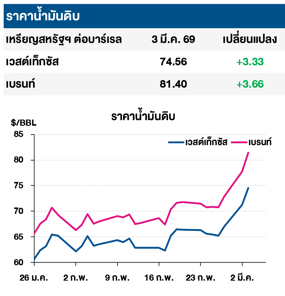 (+) ราคาน้ำมันดิบปรับเพิ่ม หลังตลาดกังวลความเสี่ยงด้านอุปทานน้ำมันดิบตึงตัวที่ได้รับผลกระทบจากการประกาศปิดช่องแคบฮอร์มุซ (Strait of Hormuz) ของกองกำลังพิทักษ์การปฏิวัติอิหร่าน (IRGC) ซึ่งส่งผลให้การเดินเรือผ่านช่องแคบดังกล่าวต้องเผชิญกับความเสี่ยงจากการโจมตีของอิหร่าน นอกจากนี้ตลาดยังคงกังวลผลกระทบจากการโจมตีของอิหร่านต่อโครงสร้างพื้นฐานด้านพลังงานของประเทศในภูมิภาคตะวันออกกลาง โดยล่าสุด คลังเก็บน้ำมันที่ท่าเรือฟูไจราห์ ประเทศสหรัฐอาหรับเอมิเรตส์ ได้รับผลกระทบจากการโจมตีของอิหร่าน โดยการโจมตีดังกล่าวสอดคล้องกับท่าทีของ IRGC ซึ่งส่งสัญญาณเพิ่มเติมว่าอาจยกระดับการโจมตีโครงสร้างพื้นฐานด้านพลังงานของประเทศในภูมิภาคเพิ่มเติม