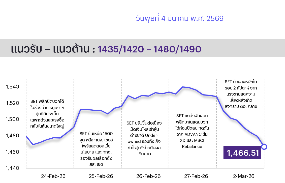คาด SET ปรับลงต่อ กดดันจากสถานการณ์สู้รบใน ตอ. กลางที่ยืดเยื้อ แม้ราคาน้ำมันพุ่งขึ้นหลังอิหร่านปิดช่องแคบฮอร์มุซจะหนุนหุ้นพลังงานต้นน้ำ แต่น่าจะถูกหักล้างด้วยความกังวลเงินเฟ้อ-ต้นทุนพลังงานเพิ่มขึ้น กระทบต่อผลประกอบการ บจ. ส่วนประเด็นในประเทศวันนี้ กกต. เตรียมประกาศรับรอง สส.บัญชีรายชื่อ ทางเทคนิคดัชนีปรับลงหลุดเส้นค่าเฉลี่ยระยะสั้น เป็นสัญญาณที่ไม่ดีนัก มีโอกาสลงมาทดสอบบริเวณ 1435/1420 ส่วนแนวต้านประเมินที่ 1480/1490 จุด