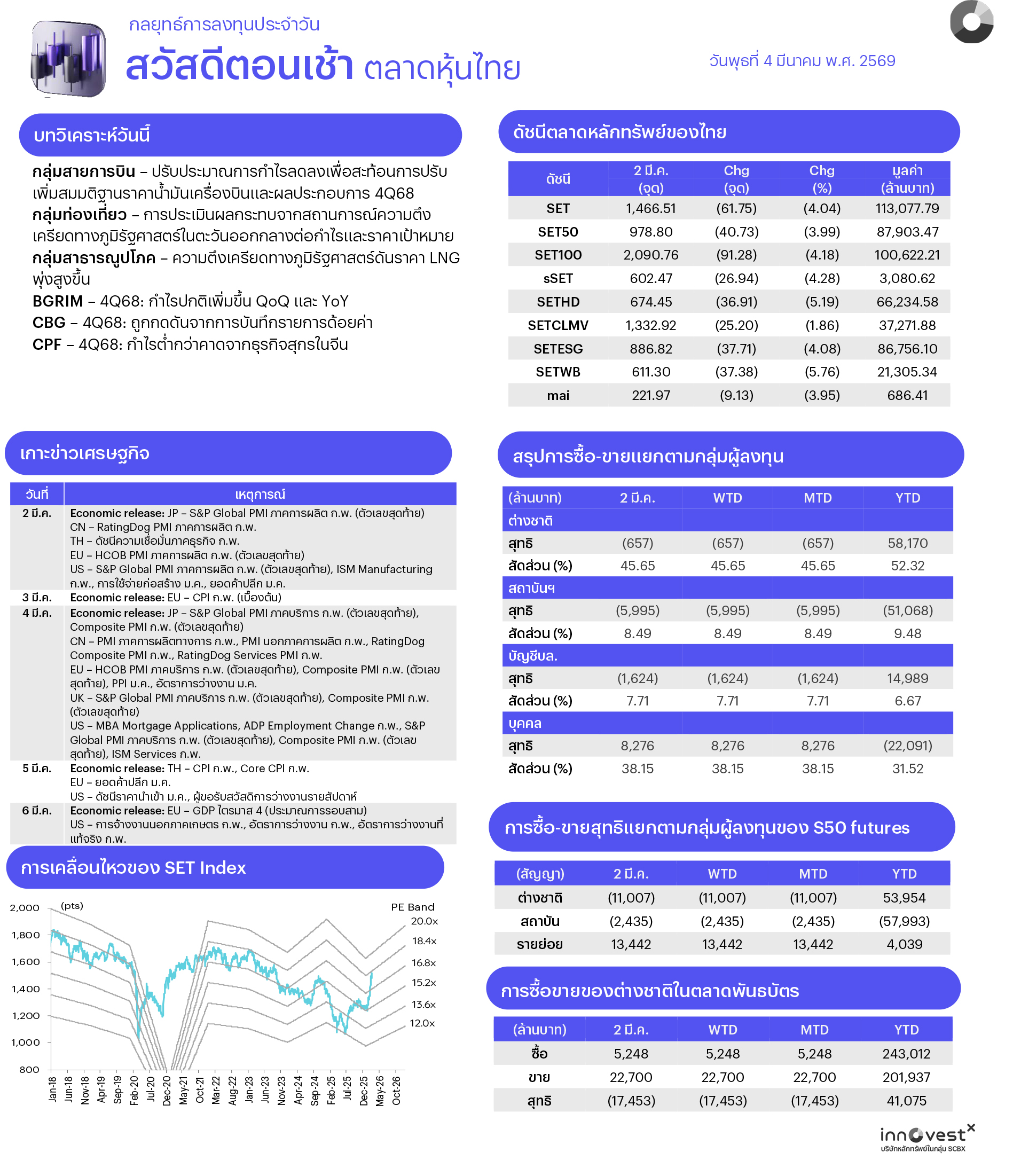• ปธน. ทรัมป์ส่งสัญญาณปฏิบัติการทางทหารในตะวันออกกลางอาจใช้เวลา 4-5 สัปดาห์ ด้านอิสราเอลเปิดฉากโจมตีรอบใหม่ใส่อิหร่านและเริ่มปฏิบัติการภาคพื้นดินในเลบานอน ล่าสุดฝรั่งเศลเตรียมส่งฝูงบินรบ Rafale คุ้มกันฐานทัพใน UAE มองสินทรัพย์เสี่ยงทั่วโลกยังเผชิญแรงกดดัน และล่าสุดราคาน้ำมันดิบ Brent อยู่ที่ระดับ US$81/bbl