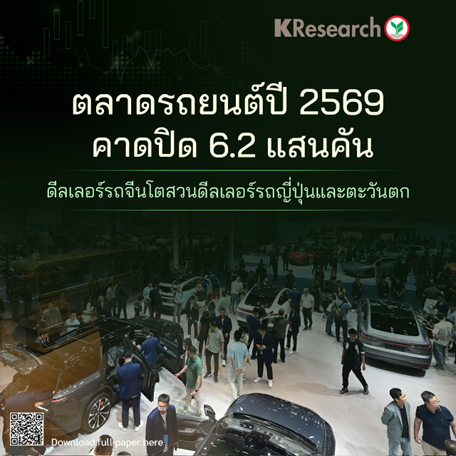 · ยอดขายรถยนต์ในประเทศปี 2569 คาดหดตัว 0.2% (YoY) สู่ระดับประมาณ 6.2 แสนคัน โดยได้รับแรงกดดันหลักจากยอดขายรถยนต์เพื่อการพาณิชย์ที่คาดลดลง 5% (YoY) แม้ยอดขายรถยนต์นั่งคาดขยายตัว 2% (YoY) ตามการเติบโตของยอดขายรถยนต์ BEV & PHEV ซึ่งคาดเพิ่มขึ้น 28% (YoY) สู่ราว 1.81 แสนคัน