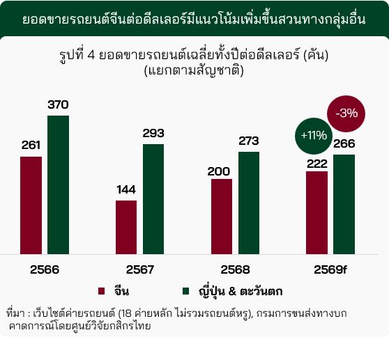 ในปี 2569 จำนวนดีลเลอร์รถยนต์จีนคาดเพิ่มขึ้นเป็นราว 730 แห่ง หรือเติบโต 10% (YoY) ตรงข้ามกับดีลเลอร์รถยนต์ญี่ปุ่นและตะวันตกที่คาดลดลงเหลือประมาณ 1,520 แห่ง หรือหดตัว 4% (YoY) (รูปที่ 3)