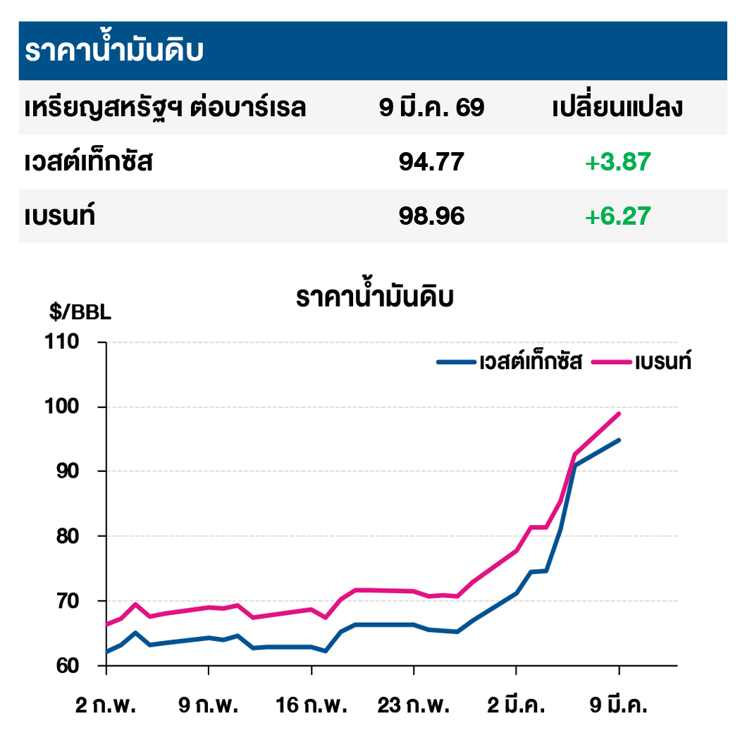 (+) ราคาน้ำมันดิบเวสต์เท็กซัสและเบรนท์ปรับตัวเพิ่มขึ้น จากความกังวลต่ออุปทานน้ำมันดิบที่ยังคงตีงตัวอย่างต่อเนื่อง หลังจากประชาชนอิหร่านบางกลุ่มได้ออกมารวมตัวด้วยการเดินขบวนบนท้องถนนเพื่อประกาศสนับสนุน โมจตาบา คาเมเนอี ผู้นำสูงสุดคนใหม่ของอิหร่าน ซึ่งเป็นการส่งสัญญาณถึงความมุ่งมั่นของประชาชนอินหร่านในการต่อต้านการโจมตีจากสหรัฐฯ และ อิสราเอล นอกจากนี้บริษัทน้ำมันของซาอุดิอาระเบีย เริ่มลดกำลังการผลิตน้ำมันดิบ เนื่องจากข้อจำกัดด้านพื้นที่จัดเก็บและเส้นทางขนส่งที่ยังคงปิดอยู่ ซึ่งเป็นการลดกำลังการผลิตเพิ่มเติมจากประเทศสหรัฐอาหรับเอมิเรตส์ อิรัก คูเวต และกาตาร์