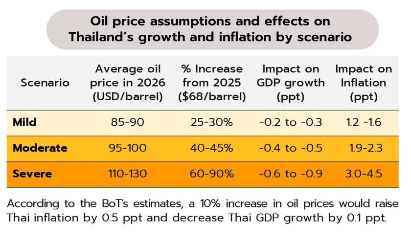 แม้อัตราเงินเฟ้อทั่วไปยังติดลบ แต่มีแนวโน้มปรับตัวสูงขึ้นจากความตึงเครียดในตะวันออกกลางซึ่งส่งผลต่อราคาพลังงานและต้นทุนการผลิต เนื่องจากไทยเป็นผู้นำเข้าพลังงานสุทธิในสัดส่วนที่สูง (13% ของการนำเข้ารวม) และพึ่งพาแหล่งนำเข้าน้ำมันจากตะวันออกกลางเป็นหลัก (สัดส่วนราว 55%) หากความตึงเครียดทางภูมิรัฐศาสตร์กดดันให้ราคาน้ำมันปรับขึ้นสู่ระดับเฉลี่ย 85-90 ดอลลาร์สหรัฐต่อบาร์เรล จะส่งผลให้อัตราเงินเฟ้อปรับเพิ่มขึ้นและอาจทำให้ GDP ลดลงจากกรณีฐานราว 0.2-0.3% แต่หากสถานการณ์รุนแรงและยืดเยื้อจนกดดันให้ราคาน้ำมันเพิ่มขึ้นสู่ระดับเฉลี่ย 110-130 ดอลลาร์สหรัฐต่อบาร์เรล จะส่งผลให้อัตราเงินเฟ้อพุ่งขึ้นและอาจทำให้ GDP ลดลงจากกรณีฐานราว 0.6-0.9% (ดังตาราง) ทั้งนี้ ผลกระทบจะมากน้อยเพียงใดยังขึ้นอยู่กับปริมาณน้ำมันสำรอง (ล่าสุดทางการระบุว่าอยู่ที่ 95 วัน) รวมทั้งมาตรการเพื่อรักษาเสถียรภาพของราคาน้ำมัน อาทิ การตรึงราคาน้ำมันดีเซลผ่านกองทุนน้ำมัน เป็นต้น