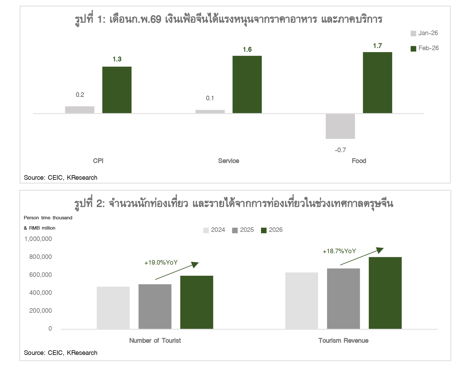 เดือนก.พ.69 เงินเฟ้อจีนขยายตัวสูงสุดในรอบ 3 ปีอยู่ที่ 1.3%YoY จาก 0.2%YoY ในเดือนม.ค.69 ได้รับปัจจัยหนุนสำคัญจากเทศกาลตรุษจีนที่ปีนี้อยู่ในเดือนก.พ.69 (ปีก่อนอยู่ช่วงปลายเดือนม.ค.69) โดยราคาสินค้าประเภทอาหาร โดยเฉพาะผักสด และผลไม้เร่งตัวขึ้น รวมถึงเงินเฟ้อในภาคบริการยังขยายตัวถึง 1.6%YoY จาก 0.1%YoY ในเดือนม.ค.69 (รูปที่ 1) ซึ่งสอดคล้องกับจำนวนนักท่องเที่ยว และรายได้จากการท่องเที่ยวช่วงเทศกาลตรุษจีนที่เพิ่มขึ้น