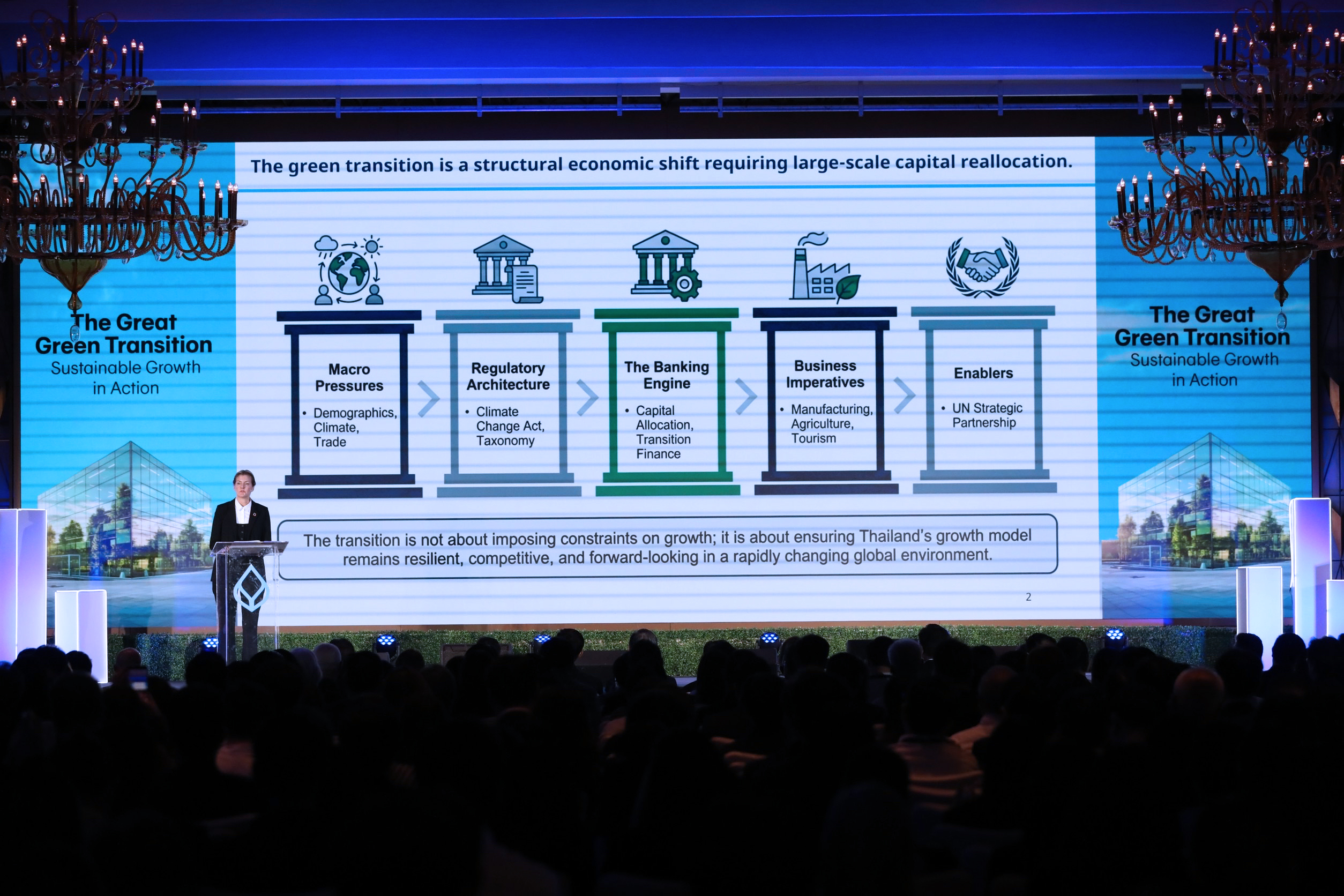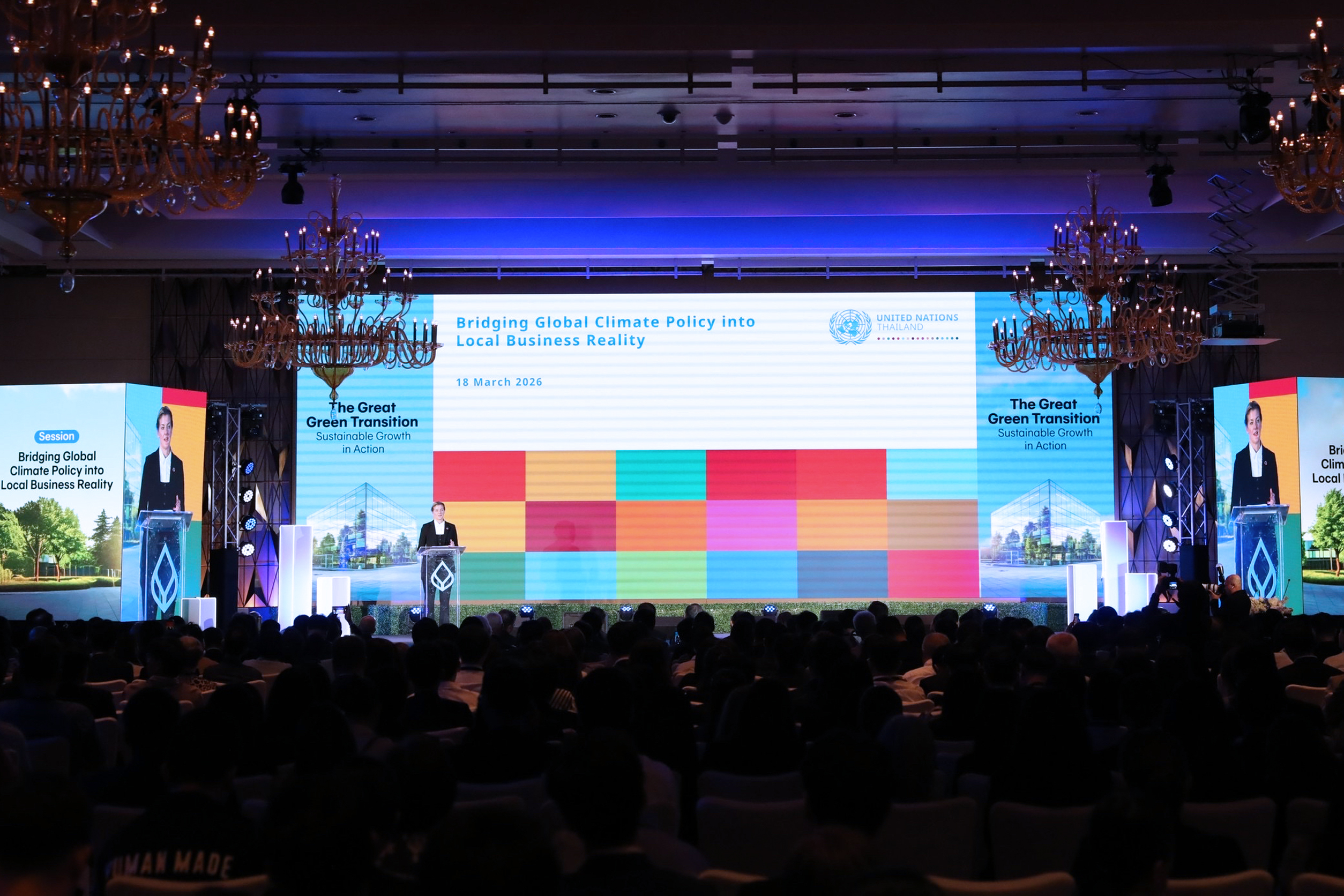 ในงานเสวนา “The Great Green Transition” ได้รับเกียรติจาก นางนีฟ คอลิเออร์-สมิธ รักษาการผู้แทนเลขาธิการสหประชาชาติประจำประเทศไทย, ผู้แทนโครงการพัฒนาแห่งสหประชาชาติประจำประเทศไทยกล่าวปาฐกถาพิเศษ หัวข้อ “Bridging Global Climate Policy into Local Business Reality” และ นายรอส คอนลอน ประธานเจ้าหน้าที่บริหาร บริษัท ซีเมนส์ จำกัด บรรยายพิเศษ หัวข้อ “Transformative Innovations Shaping the Future of Sustainable Business” มาให้ความรู้ถึงหลักกฎเกณฑ์ที่จะมีผลกระทบกับภาคธุรกิจและนวัตกรรมสมัยใหม่ ที่สามารถลดการใช้พลังงานและการปล่อยก๊าซเรือนกระจก