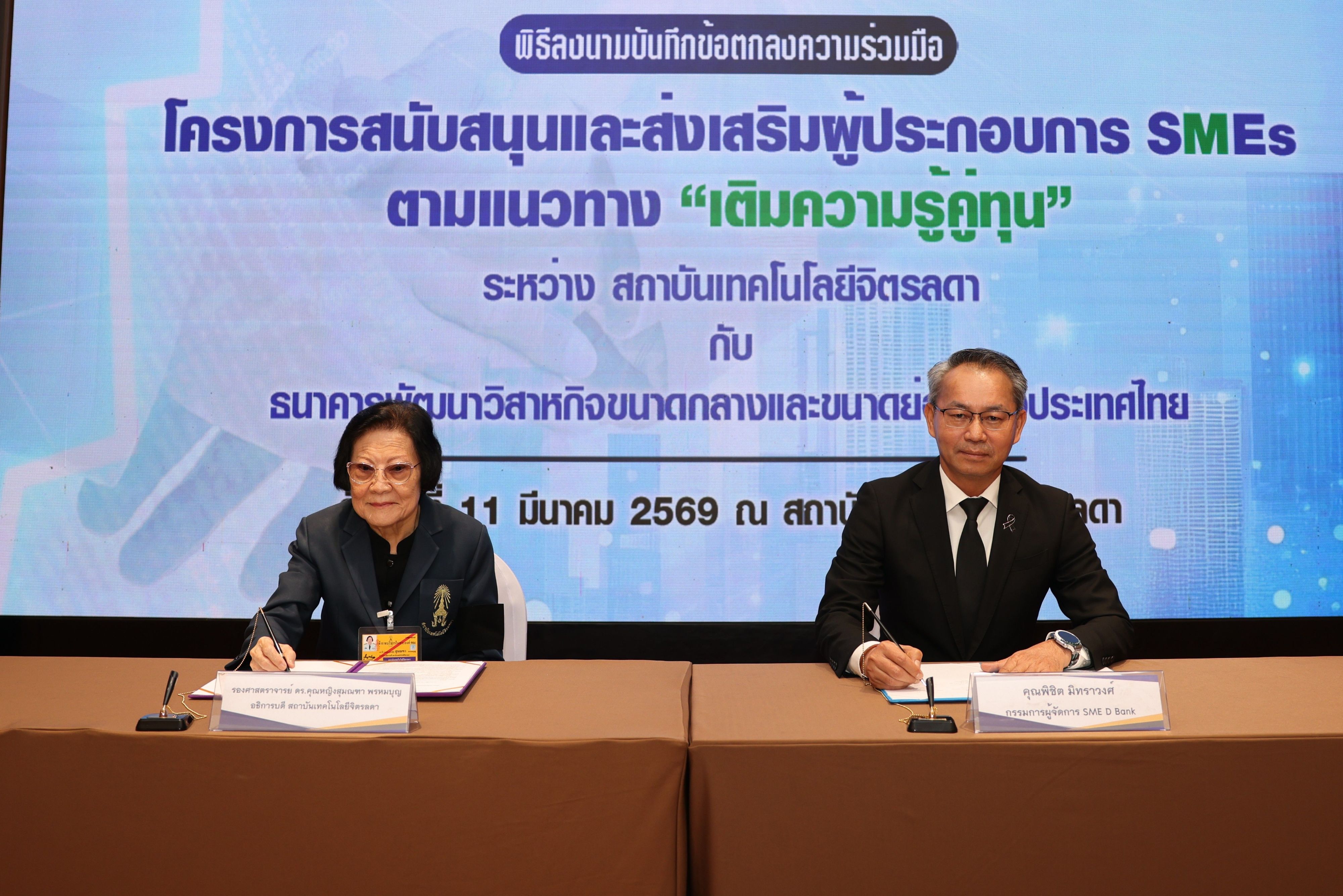 นายพิชิต มิทราวงศ์ กรรมการผู้จัดการ ธนาคารพัฒนาวิสาหกิจขนาดกลางและขนาดย่อมแห่งประเทศ ไทย (ธพว.) หรือ SME D Bank และ รองศาสตราจารย์ ดร.คุณหญิงสุมณฑา พรหมบุญ อธิการบดี สถาบันเทคโนโลยีจิตรลดา (สจด.) ร่วมลงนามบันทึกข้อตกลงความร่วมมือ ภายใต้ โครงการสนับสนุนและส่งเสริมผู้ประกอบการ SMEs ตามแนวทาง "เติมความรู้คู่ทุน" มีเป้าหมายร่วมกันพัฒนาศักยภาพให้แก่นักเรียน นักศึกษา และเครือข่ายสถานประกอบการของสถาบันฯ ให้มีความรู้ ทักษะ และทัศนคติของการเป็นผู้ประกอบการ (Entrepreneurial Competency) ควบคู่กับการเสริมสร้างองค์ความรู้ด้านการเงิน (Financial Literacy) อีกทั้ง ยังมุ่งพัฒนาระบบนิเวศนวัตกรรม (Innovation Ecosystem) ที่เชื่อมโยงระหว่างนักศึกษา คณาจารย์ เครือข่ายผู้ประกอบการ และแหล่งเงินทุน เพื่อเสริมสร้างความเข้มแข็งในการพัฒนาผู้ประกอบการรุ่นใหม่ และสนับสนุนการพัฒนานวัตกรรมทางธุรกิจอย่างยั่งยืน ณ ห้องสิรินธรพัฒนวิทย์ ชั้น 4 อาคาร 605 สถาบันเทคโนโลยีจิตรลดา เมื่อเร็วๆ นี้