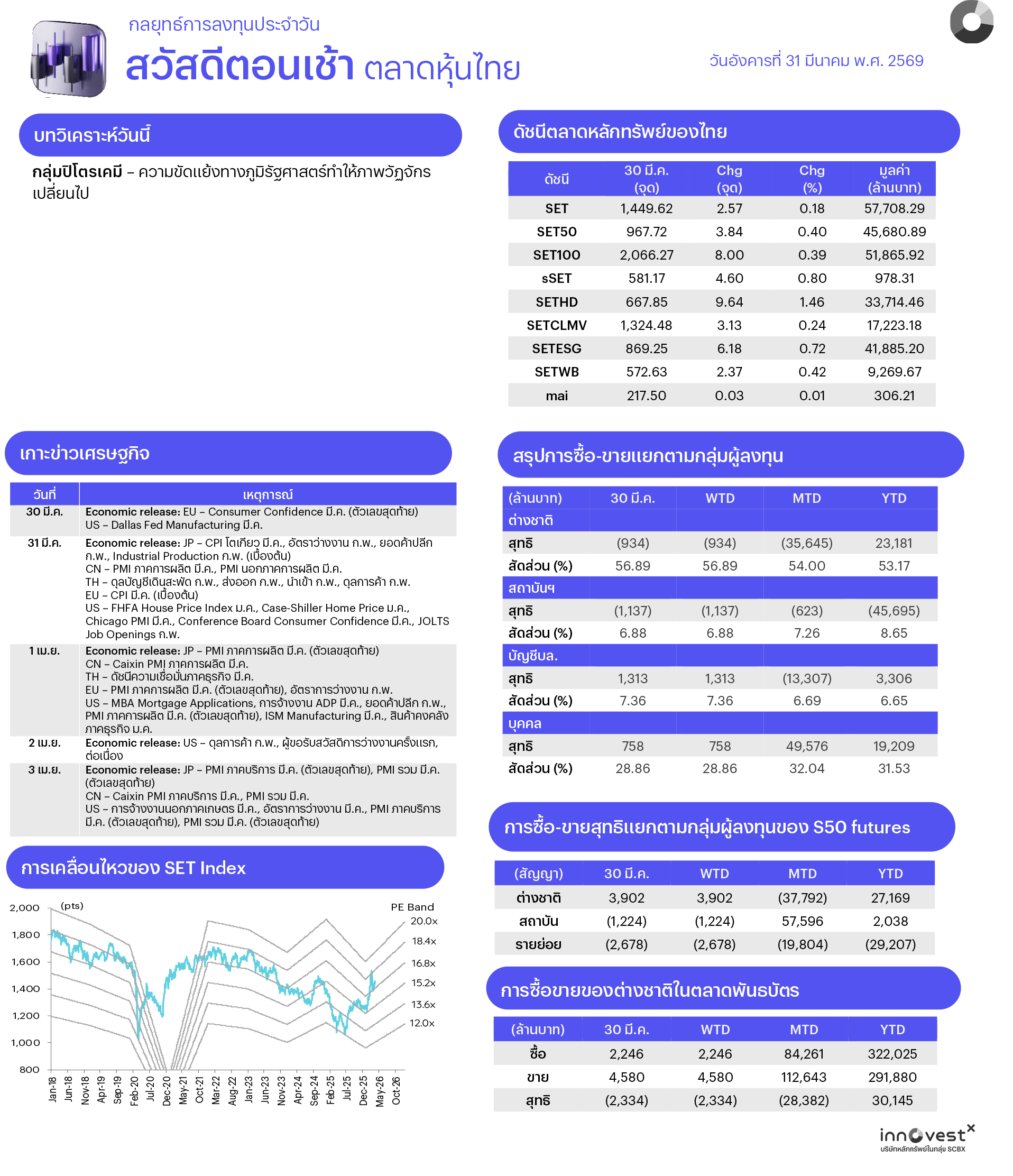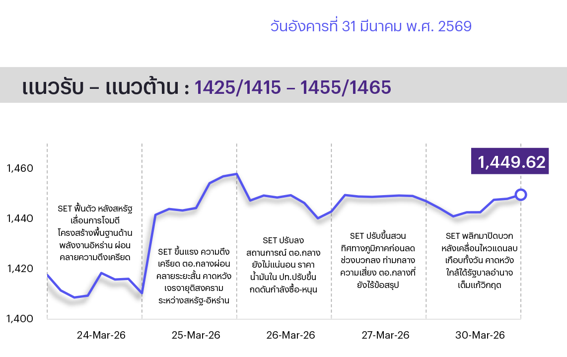 ช่วงสั้นมอง SET ยังผันผวนสูงจากแรงขายลดความเสี่ยงหลังสถานการณ์ในตะวันออกกลางยังตึงเครียด โดยทิศทางของ SET จะขึ้นกับผลการเจรจาเป็นสำคัญ โดยหากการเจรจาล้มเหลวหรือเกิดการเผชิญหน้าทางทหารรุนแรงขึ้นคาด SET มีโอกาสปรับตัวลงไปทดสอบจุดต่ำสุดเดิมหรือต่ำกว่าที่ 1,320-1,350 จุด แต่หากบรรลุข้อตกลงสันติภาพที่ถาวรคาด SET มีโอกาสปรับขึ้นไปทดสอบที่ 1,500-1,530 จุด สะท้อนการกลับมาของความเชื่อมั่นลงทุนและการฟื้นตัวของกำไร บจ. ที่เคยถูกกดดันจากวิกฤติพลังงานก่อนหน้านี้ ท่ามกลางความผันผวนจึงทำให้กลยุทธ์ลงทุนยังแบ่งตามระดับความเสี่ยงของนักลงทุน