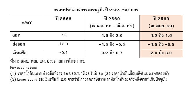 • เศรษฐกิจไทยได้รับผลกระทบจากราคาพลังงานที่ดีดตัวสูงขึ้น โดยอัตราเงินเฟ้อเฉลี่ยในปี 2569 จะเร่งตัวขึ้นมาอยู่ในช่วง 2.0% – 3.0% จากเดิมที่คาดว่าจะอยู่ในกรอบ 0.2% - 0.7% จากราคาน้ำมันขายปลีกที่ปรับตัวสูงขึ้นตามกลไกตลาด ขณะที่ต้องเฝ้าระวังผลกระทบต่อแรงขับเคลื่อนเศรษฐกิจจากค่าครองชีพที่สูงขึ้น ทั้งการบริโภคและความเชื่อมั่นภาคเอกชน การปรับเปลี่ยนการใช้จ่ายของภาครัฐที่อาจจะต้องมีการก่อหนี้เพิ่มเพื่อประคองเศรษฐกิจ ภาคการผลิตที่ต้องบริหารจัดการต้นทุนเพื่อรักษาความสามารถในการแข่งขัน และการส่งออกที่จะได้รับผลกระทบจาก logistics disruption ตลอดจนจำนวนนักท่องเที่ยวต่างชาติที่คาดว่าจะได้รับผลกระทบจากข้อจำกัดการเดินทางราว 1 ล้านคนในช่วงสามเดือนข้างหน้า โดย คาดว่าการเติบโตของ GDP ไทย ปี 2569 จะลดมาอยู่ที่ 1.2% - 1.6% จากเดิมคาดว่าจะโตที่ 1.6% - 2.0% อย่างไรก็ดี ราคาน้ำมันอาจสูงขึ้นมากกว่าที่ประเมินหากเหตุการณ์ขยายวงกว้างขึ้นซึ่งต้องติดตามสถานการณ์อย่างใกล้ชิดต่อไป