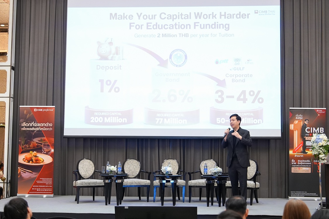 ภูดินันท์ เศรษฐนันท์ Head, Affluent & Wealth Management ธนาคาร ซีไอเอ็มบี ไทย เปิดเผยว่า การศึกษาและการลงทุน สองสิ่งนี้ต้องเดินไปด้วยกัน การบริหารเงินอย่างชาญฉลาด จะตอบโจทย์การศึกษาลูกให้มีประสิทธิภาพมากขึ้น ทีม Wealth CIMB THAI ขอเป็นส่วนหนึ่งที่จะร่วมเดินทางไปกับลูกค้าเริ่มต้นด้วยการจัดงานสัมมนาให้ความรู้ ‘Overseas Education x Financial Solution เปิดเส้นทางสู่การศึกษาต่อต่างประเทศอย่างมั่นใจ’ เพราะคำถามที่ผู้ปกครองหลายคนมีตรงกันคือ ส่งลูกไปเรียนต่อต่างประเทศที่ไหนดี เช่น สหรัฐหรือสวิตเซอร์แลนด์ และต้องเตรียมเงินอย่างไรให้เพียงพอ ธนาคารจึงเชิญผู้เชี่ยวชาญด้านการศึกษามาให้ความรู้ ผสานกับผู้เชี่ยวชาญ CIMB THAI แนะเตรียมความพร้อมต้นทุนค่าการศึกษาด้วยการวางเงินลงทุนให้ตรงจุด ผลตอบแทนที่งอกเงยสามารถครอบคลุมค่าเล่าเรียนตลอดเส้นทาง และเมื่อลูกหลานเรียบจบ เงินต้นอยู่ครบ เรียกได้ว่า ออกแบบแผนเรียนฟรีได้ ถ้าใช้ตราสารหนี้