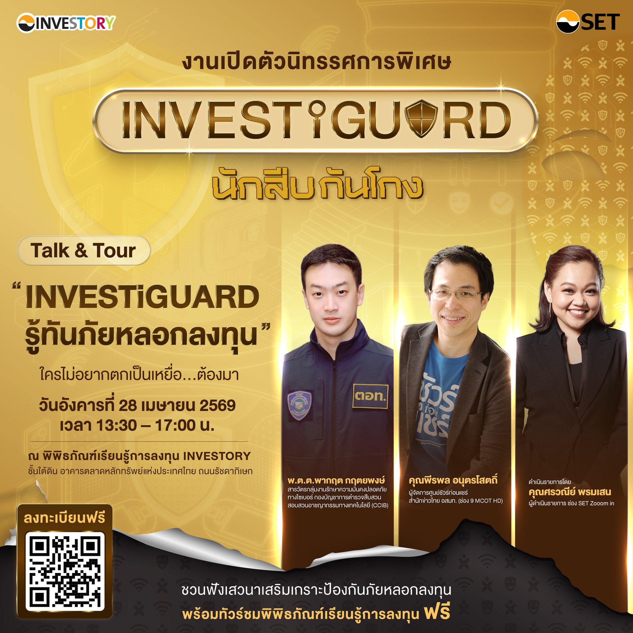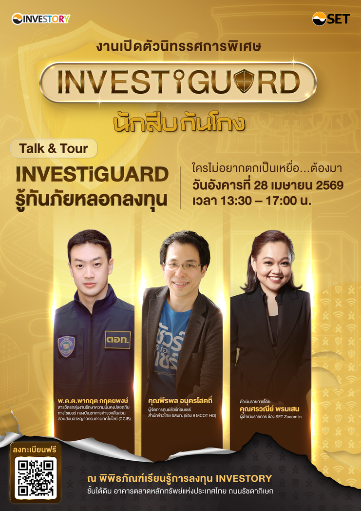 พิพิธภัณฑ์เรียนรู้การลงทุน INVESTORY ตลาดหลักทรัพย์แห่งประเทศไทย เชิญชวนผู้สนใจมาสัมผัสประสบการณ์เรียนรู้กับนิทรรศการพิเศษชุดใหม่ “INVESTiGUARD นักสืบกันโกง” เรียนรู้ด้วยตนเองและฝึกทักษะสังเกตกลโกงผ่านเกมที่จะช่วยสร้างเกราะป้องกันให้รู้เท่าทันมิจฉาชีพ พร้อมร่วมฟังเสวนาหัวข้อ "INVESTiGUARD รู้ทันภัยหลอกลงทุน" เจาะลึกภัยไซเบอร์ที่ต้องระวังในปัจจุบัน พบกับวิทยากรผู้เชี่ยวชาญ นำโดย พันตำรวจตรี พากฤต กฤตยพงษ์ สารวัตรกลุ่มงานรักษาความมั่นคงปลอดภัยทางไซเบอร์ กองบัญชาการตำรวจสืบสวนสอบสวนอาชญากรรมทางเทคโนโลยี (CCIB) และคุณพีรพล อนุตรโสตถิ์ ผู้จัดการศูนย์ชัวร์ก่อนแชร์ สำนักข่าวไทย อสมท. ดำเนินรายการโดย คุณศรวณีย์ พรมเสน ผู้ดำเนินรายการช่อง SET Zooom in