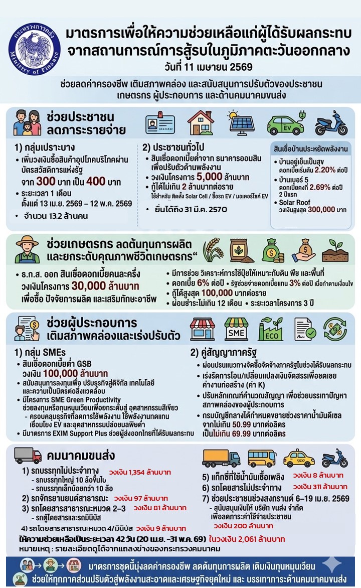 นายเอกนิติ นิติทัณฑ์ประภาศ รองนายกรัฐมนตรีและรัฐมนตรีว่าการกระทรวงการคลัง (นายเอกนิติฯ) เปิดเผยว่า เมื่อวันที่ 11 เมษายน 2569 คณะรัฐมนตรีได้มีมติเห็นชอบมาตรการให้ความช่วยเหลือแก่ผู้ที่ได้รับผลกระทบจากสถานการณ์การสู้รบในภูมิภาคตะวันออกกลาง เพื่อเป็นการบรรเทาผลกระทบและป้องกันความเสี่ยงทางเศรษฐกิจจากสถานการณ์ดังกล่าว ที่อาจส่งผลให้เกิดภาวะเศรษฐกิจชะลอตัวควบคู่กับอัตราเงินเฟ้อที่พุ่งสูงขึ้น (Stagflation) ซึ่งจะส่งผลกระทบต่อทุกภาคส่วน รัฐบาลจึงได้มี (1) มาตรการบรรเทาภาระค่าครองชีพของประชาชนกลุ่มเปราะบาง ภาคขนส่ง และเกษตรกร ท่ามกลางสถานการณ์ที่ยังมีความไม่แน่นอนสูง รวมทั้ง (2) มาตรการสนับสนุนให้ประชาชนและผู้ประกอบการปรับตัว (Transform) และหันมาใช้พลังงานสะอาดทดแทนน้ำมันให้มากขึ้น และมาตรการช่วยเหลือผู้ประกอบการและภาคการเกษตรที่เป็นต้นน้ำของห่วงโซ่อุปทาน (Supply Chain) ของประเทศ ให้ได้รับความช่วยเหลืออย่างทั่วถึง และมีสภาพคล่องเพียงพอต่อการดำเนินธุรกิจและการทำการเกษตร โดยรัฐบาลคาดหวังว่ามาตรการให้ความช่วยเหลือดังกล่าวจะเป็นการแบ่งเบาภาระและช่วยลดต้นทุนให้แก่ผู้ประกอบการและเกษตรกร ซึ่งจะช่วยลดการส่งผ่านภาระต้นทุนไปสู่ผู้บริโภค โดยคณะรัฐมนตรีได้มีมติเห็นชอบมาตรการเพื่อให้ความช่วยเหลือแก่ผู้ที่ได้รับผลกระทบจากสถานการณ์การสู้รบในภูมิภาคตะวันออกกลาง ดังนี้