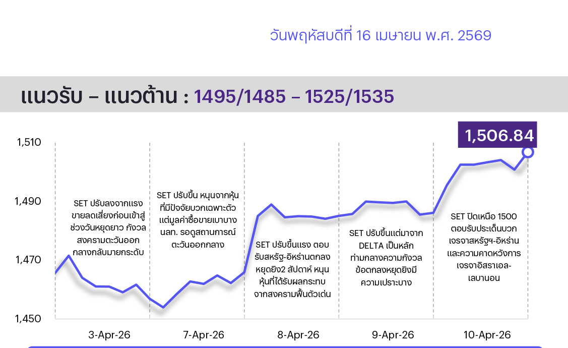 คาด SET ปรับขึ้น นักลงทุนเข้าสู่ภาวะ Risk on ความตึงเครียดผ่อนคลายลง หลังสหรัฐฯและอิหร่านเปิดทางพร้อมกลับมาเจรจาเพื่อยุติสงครามอีกรอบ รวมทั้งคาดหวัง ปธน. ทรัมป์ ผลักดันเปิดช่องแคบฮอร์มุซอย่างถาวรเพื่อลดผลกระทบต่อตลาดน้ำมันโลก ขณะที่ปัจจัยในประเทศติดตามการเข้าสู่ช่วงรายงานงบ 1Q69 เริ่มที่กลุ่มธนาคาร โดยวันนี้ TISCO จะรายงานเป็นแห่งแรก ทางเทคนิคดัชนีไต่ระดับขึ้นต่อเนื่อง ประเมินแนวต้าน 1525-1535 แนวรับ 1495-1485